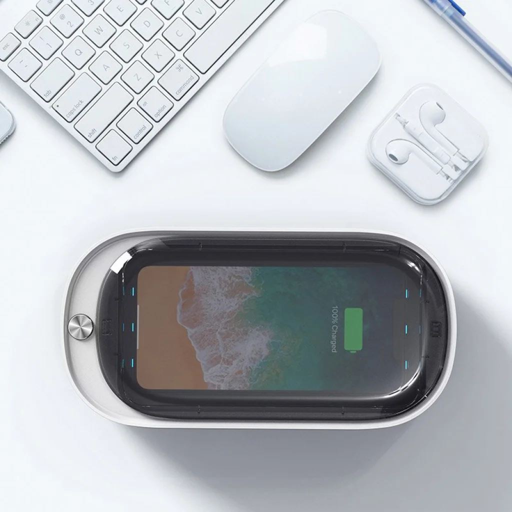 Mobiltelefonok sterilizálására szolgáló, hordozható eszköz, UV fénnyel. Tartozék USB kábellel a töltéshez. A fertőtlenítési folyamathoz nincs szükség semmilyen folyadékra, csak az UV fényre mely a mikroorganizmusok, így kórokozók 99.99%-át elpusztítja. Az okostelefonokon túl, a fertőtlenítési folyamat alkalmazható ékszereken, fogkeféken, szemüvegeken, órákon, alsóneműkön, szépségápolási eszközökön és egyéb kisebb, kompatibilis méretű eszközön. A sterilizáló eszköz sarkában található aroma szivacs lehetővé teszi hogy néhány csepp parfümmel vagy illóolajjal illatosíthassuk is a behelyezett, sterilizálandó eszközt.