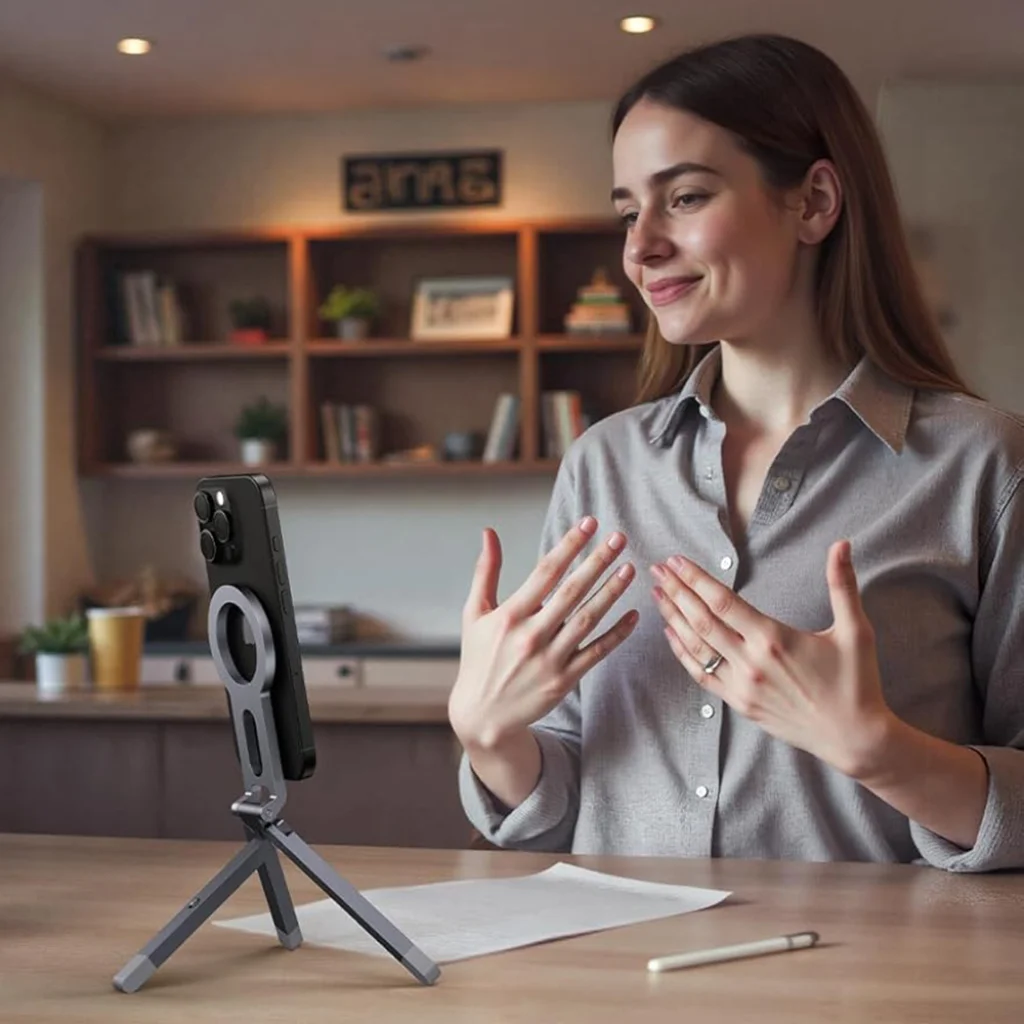 - Ultra-hordozható és összecsukható kialakítás: Az állvány rendkívül kompakt méretűre összehajtható, így könnyedén elfér a zsebében vagy a táskájában. Tökéletes választás utazáshoz, ingázáshoz vagy bármilyen helyzethez, ahol gyorsan szüksége van egy megbízható telefontartóra.