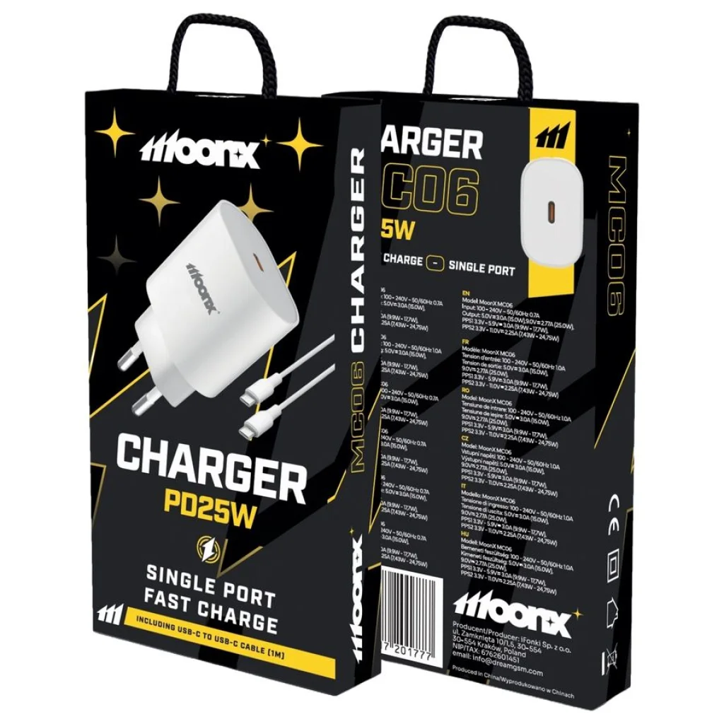 A MOONX MC06 fali töltő egy modern és nagy teljesítményű megoldás eszközei gyors és hatékony töltésére. Az akár 25W Power Delivery (PD) technológiának köszönhetően pillanatok alatt feltöltheti okostelefonját, tabletjét vagy más USB-C kompatibilis eszközét. A csomagban található 1 méteres USB-C - USB-C kábellel azonnal használatba veheti a töltőt, így nem kell külön beszereznie hozzá semmit.
