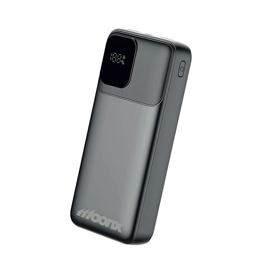 A MOONX MP02 power bank nem csupán erős, hanem rendkívül praktikus és felhasználóbarát is. Az elegáns fekete burkolat, kiegészítve a modern, textúrált felülettel, kiválóan illeszkedik a mai tech eszközök esztétikájához. Az integrált digitális LED kijelző folyamatosan tájékoztatja Önt az akkumulátor pontos töltöttségi szintjéről százalékban, így soha nem éri meglepetés. A kényelmesen elhelyezett bekapcsológombbal egyszerűen kezelheti a power bankot.