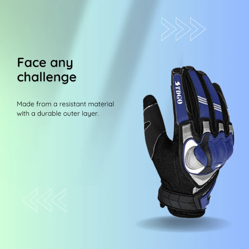 Az ergonómikus kialakítás tökéletes illeszkedést biztosít a kézre, garantálva a maximális kényelmet még hosszabb utazások során is. A csúszásmentes tenyérrész stabil és biztonságos fogást nyújt a kormánynál, növelve a kontrollt és a biztonságot. A "perfect fit on the hands" (tökéletes illeszkedés a kézre) és az "outstanding features, top design" (kiemelkedő tulajdonságok, csúcs design) magabiztos megjelenést kölcsönöz, miközben a tartós külső rétegnek köszönhetően "face any challenge" (bármilyen kihívással szembenézhetsz). A kék és fekete színkombináció modern és sportos megjelenést biztosít.