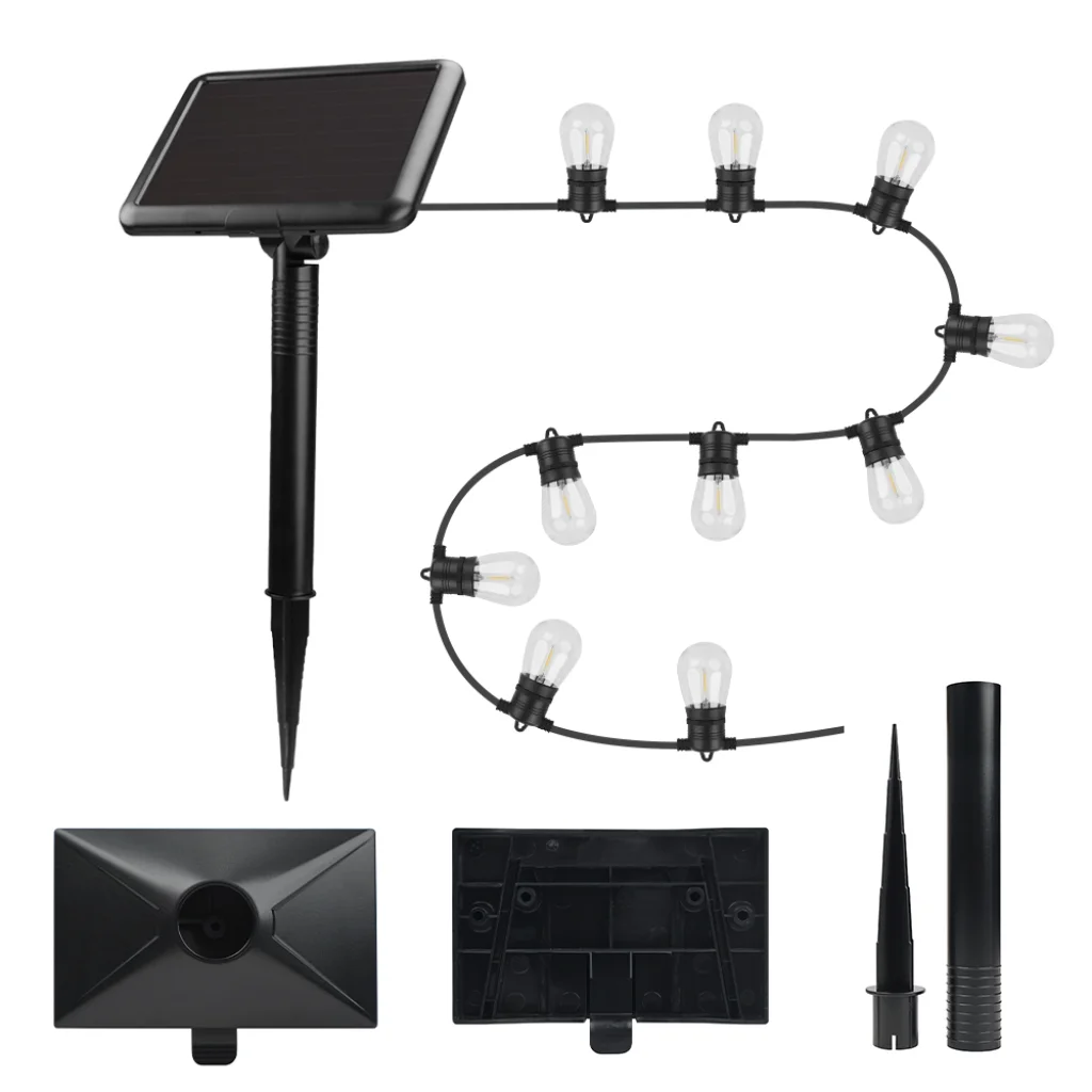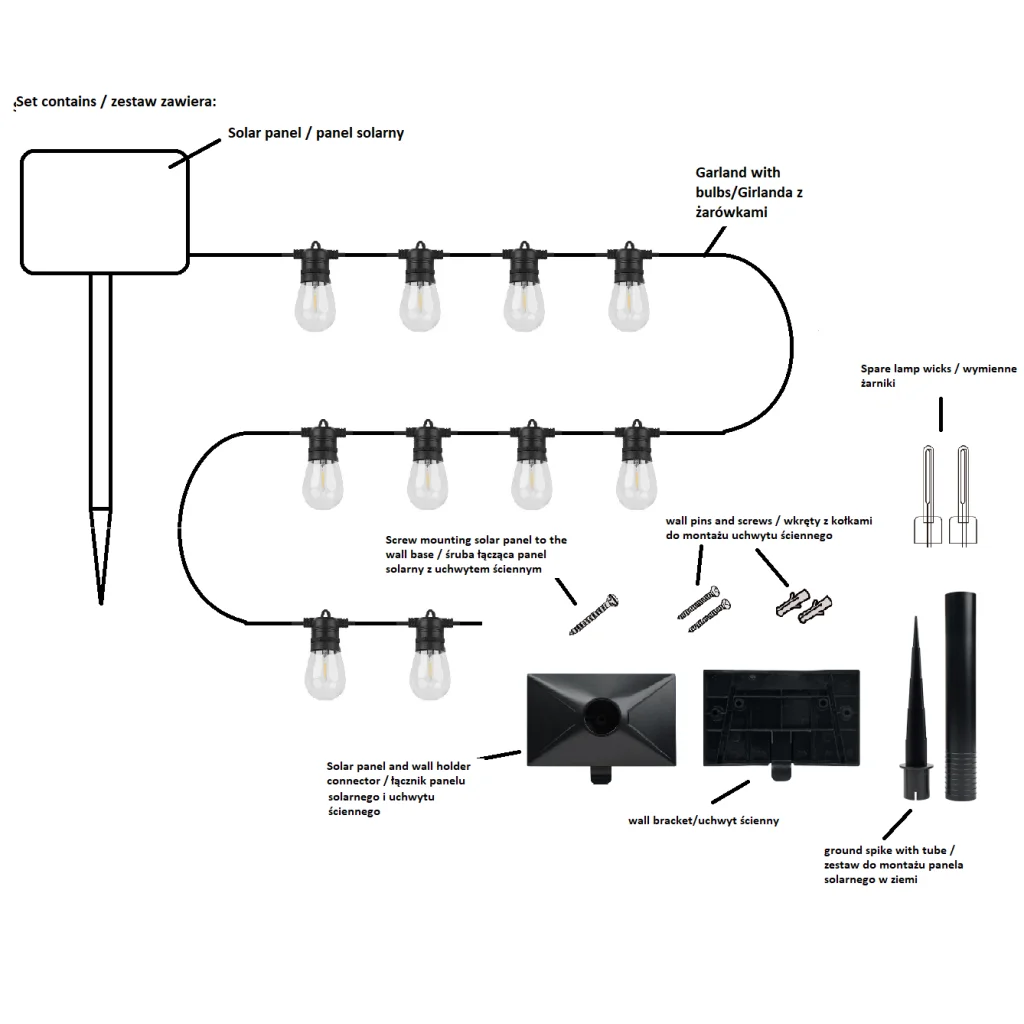 Az FLS-60 napelemes girland 10 kellemes árnyalatú fényforrással rendelkezik, amelyek egy 7,5 méteres kábelre vannak feszítve. A lámpatestben elhelyezett izzók alkalmasak az önálló cserére. A készlet tartalmaz két pótizzót, ami növeli a felhasználói kényelmet és meghosszabbítja a girland élettartamát.