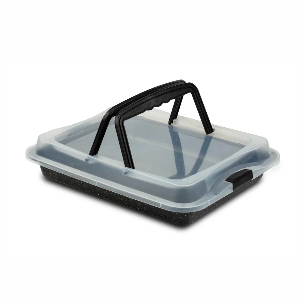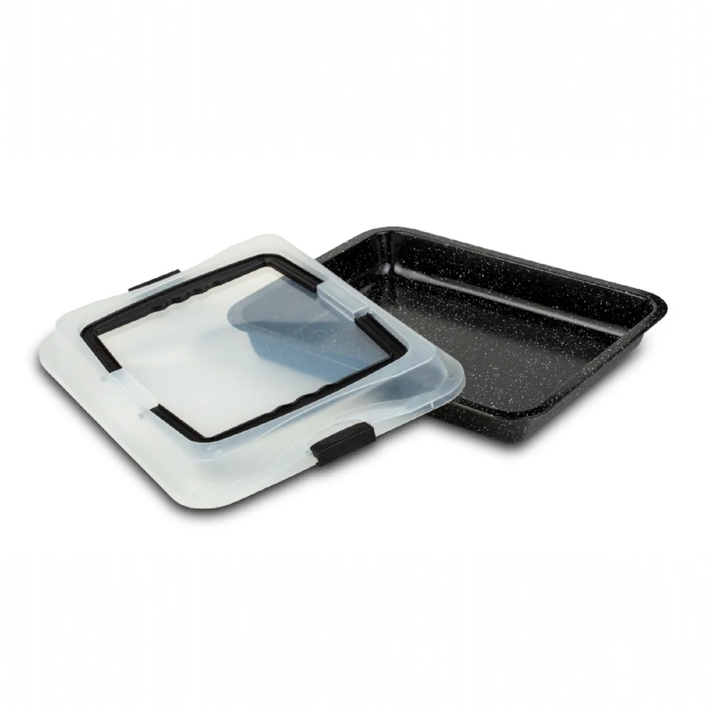A sütőedény szénacélból készült, amely könnyű, mégis tartós, így hosszú távon is megbízható társ lesz a konyhában. A 0,4 mm vastagságú kialakítás gondoskodik arról, hogy az edény jól bírja a magas hőmérsékletet, miközben nem nehezíti meg a mindennapi használatot. A hozzá tartozó kapcsos műanyag fedél hordfüllel lehetővé teszi az elkészült ételek biztonságos szállítását és higiénikus tárolását – tökéletes, ha vendégségbe vagy piknikre visz süteményt vagy rakott ételt.