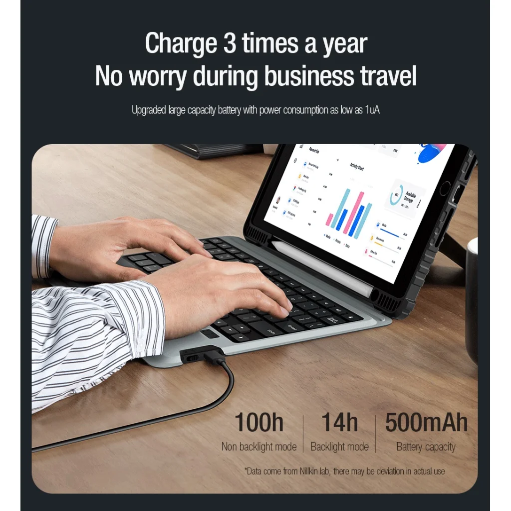 A nagy kapacitású akkumulátor gondoskodik az Apple Ceruza töltéséről és a vezeték nélküli billentyűzet áramellátásáról, amelyet szükség esetén mindössze 3 óra alatt tölthet fel 100%-ra. Folyamatos használat esetén a billentyűzet akár 100 óráig is bírja. Háttérvilágítás bekapcsolt állapotában az akkumulátor élettartama 14 órára csökken.