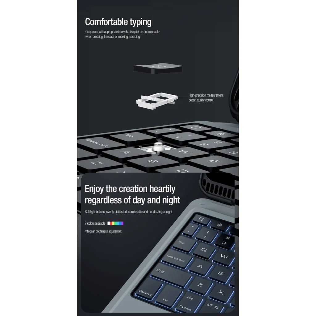 A tok kiváló minőségű vezeték nélküli billentyűzetet kínál alacsony emeléssel, csendes és tartós kapcsolókkal és precíz billentyűprofilozással a legkényelmesebb gépelés érdekében. A billentyűzet háttérvilágítással is fel van szerelve, amelyhez választhat színt. 7 különböző szín közül választhat. A tokba integrált töltőnyílás található közvetlenül az Apple Ceruzához, így mindig magánál tarthatja, és ami a legfontosabb, mindig teljesen feltöltött lesz.