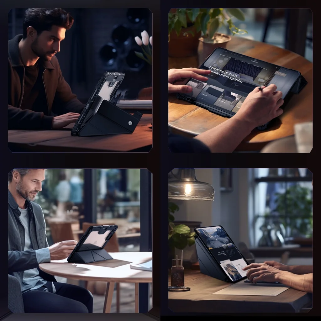 Az egyedi hajtogatható fedél különböző szögekben állítja be a tabletet íráshoz, olvasáshoz és böngészéshez.