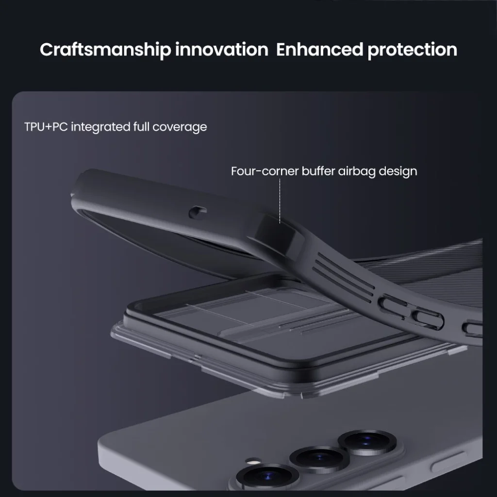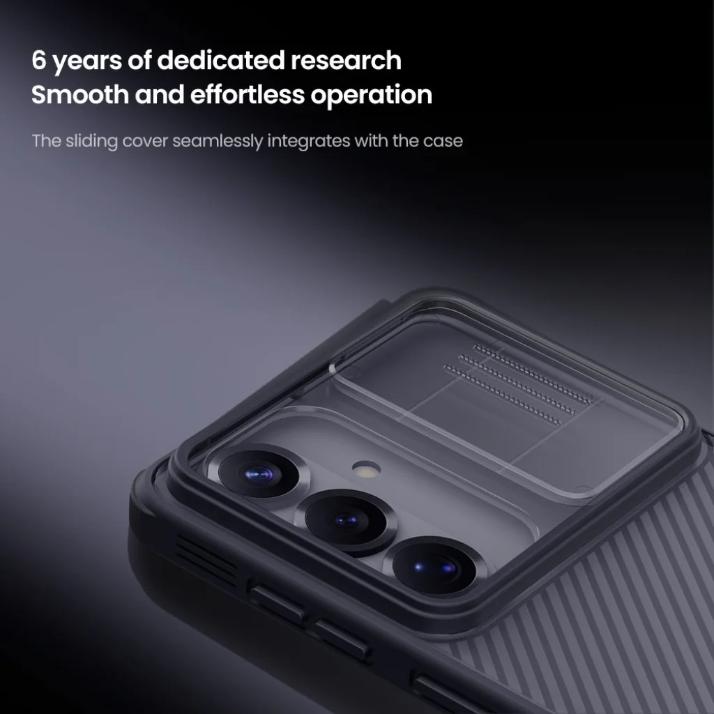 A Nillkin CamShield PRO tok tökéletesen illeszkedik a Samsung Galaxy S26 készülékéhez, mintha a telefonnal együtt tervezték volna. Az átlátszó fekete árnyalat és a stílusos, bordázott hátlap modern és professzionális megjelenést kölcsönöz készülékének.