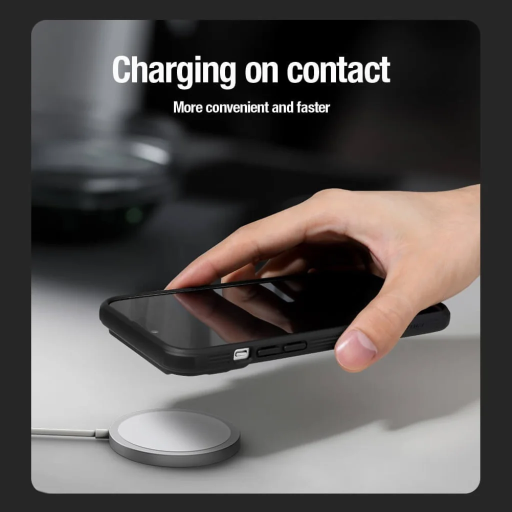 A CamShield mágneses tok biztonságosan rögzíti telefonod a MagSafe vezeték nélküli töltőhöz a gyors töltéshez. Szintén megfelelő a bőr MagSafe kártyatartóhoz.