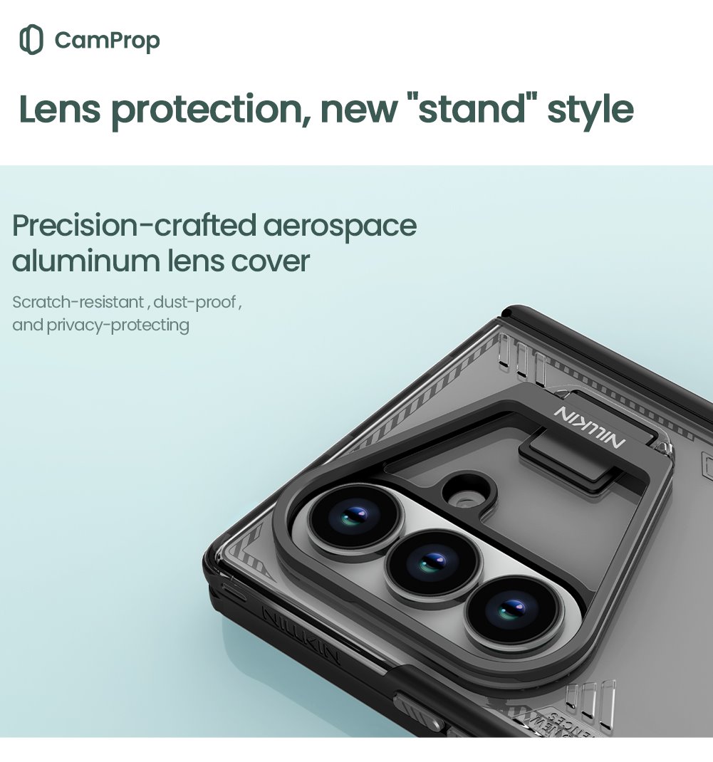 - A forradalmi CamProp kialakítású kamera fedél precízen kidolgozott repülőgép-alumíniumból készült. Ez a robusztus anyag hatékonyan védi a lencséket a karcolásoktól és a portól.