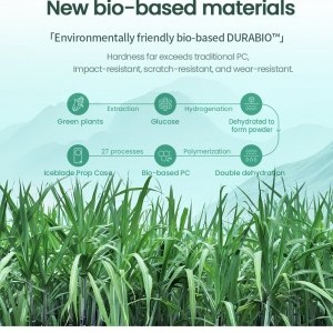 - Ez az egyedülálló tok megújuló növényi forrásokból, például cukornádból származó, bio-alapú DURABIO™ anyagok felhasználásával készült. Ez a fejlett gyártási folyamat jelentősen csökkenti a szénlábnyomot, környezetbarátabb alternatívát kínálva a hagyományos műanyagokkal szemben.