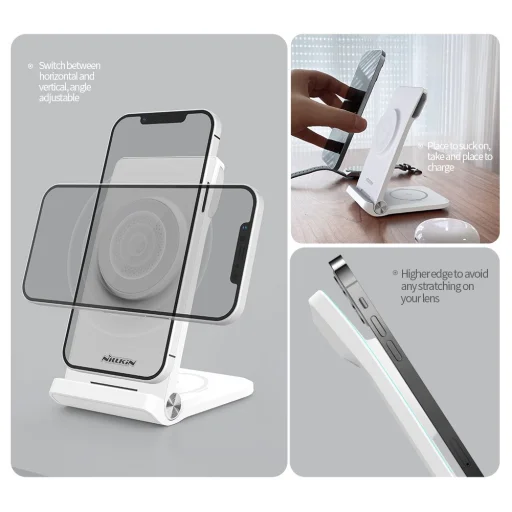 Nillkin PowerTrio vezeték nélküli töltő MagSafe támogatással a telefonodhoz, vezeték nélküli fejhallgatódhoz és Samsung Watch-hoz.