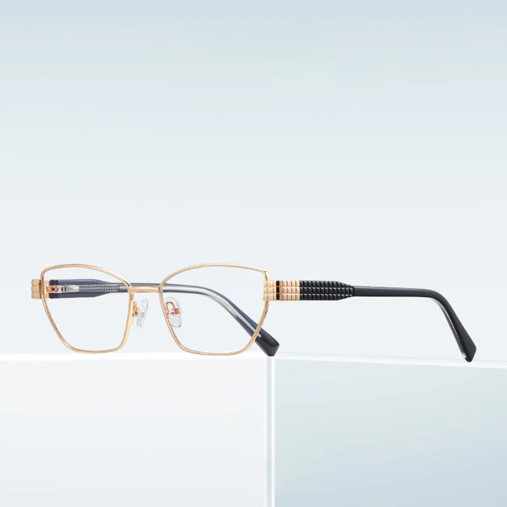 A Techsuit Reflex PC (3162) szemüveg egyedi és modern dizájnja azonnal magára vonzza a tekinteteket. A fekete és arany színek elegáns kombinációja, valamint a részletgazdag, mintázott szárak luxus érzetet kölcsönöznek. A prémium minőségű fémkeret garantálja a tartósságot és a kényelmes viseletet egész nap. Az enyhén szögletes, modern macskaszem/trapéz forma kiemeli az arcvonásokat, miközben kifinomult megjelenést kölcsönöz viselőjének.