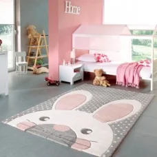 A vidám színvilágú, bájos nyuszi mintás gyerekszőnyeg bármely gyermek szívét azonnal elvarázsolja.