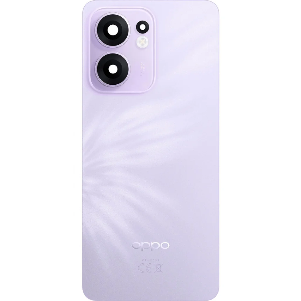 Oppo Reno13 FS 5G / Reno13 F akkumulátor hátlap - Plume Purple. Az Oppo licensze alatt gyártott tartalékalkatrész, amely a sérült hátlap cseréjére szolgál a telefonján. Tartalmazza a ragasztót és a kamera lencsét.