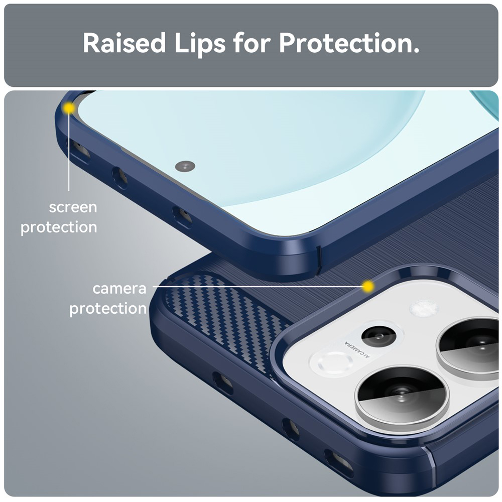 - Modern karbon szálas részletek: A tok felső és alsó részén, valamint a kamera körül elhelyezett karbon szálas mintázat egyedi és sportos megjelenést kölcsönöz, harmonizálva a kék színnel.