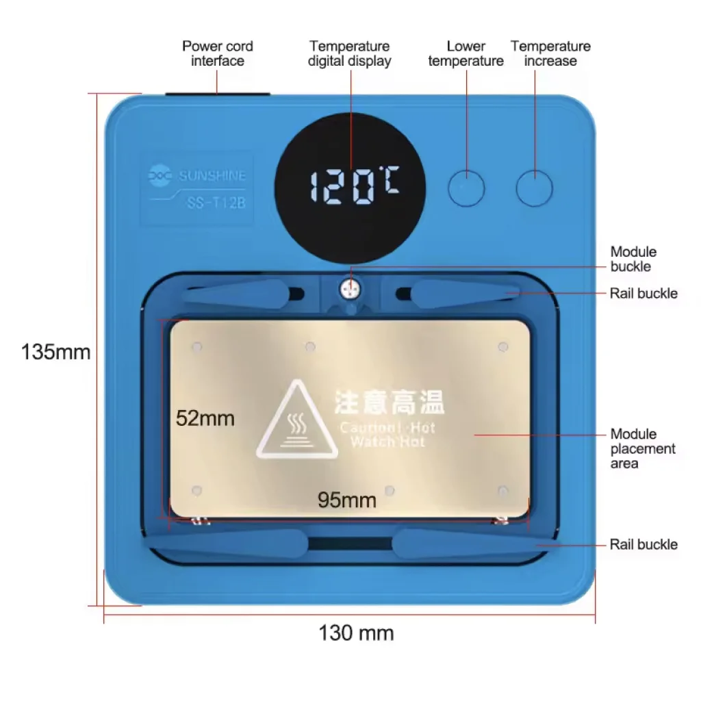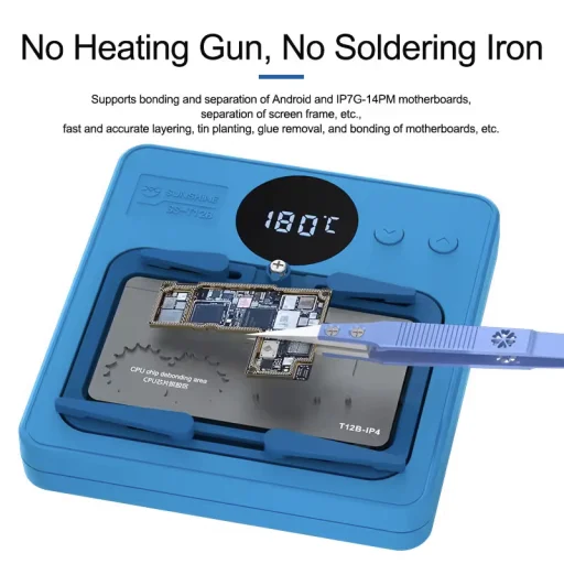 A Heating Module PCB Sunshine SS-T12B tok Apple iPhone / Android sorozat számára egy professzionális eszköz, amelyet főbb áramkörök forrasztására és szétválasztására terveztek, kompatibilis a Samsung S23-S24, iPhone 7-16 és különféle Android modellekkel. Gyors és precíz megoldást nyújt összetett műveletekhez, mint például az áramköri rétegek kezelése, ón ültetés, ragasztó eltávolítás és forrasztás, lehetővé téve a hatékony, magas minőségű javításokat. Moduláris kialakítása támogatja több modul kombinációját, kiváló skálázhatóságot és egyszerű bővítést kínál új modellek és technológiák befogadásához. Az intelligens hőmérséklet-szabályozó rendszer biztosítja az anyagok különböző olvadáspontjai szerint történő pontos beállítást, garantálva az egyenletes és gyors felfűtést, miközben meghosszabbítja a készülék élettartamát. A 360 fokos forgatható csat és vezetősín rendszer lehetővé teszi az eltérő formájú főbb áramkörök biztonságos és precíz rögzítését, jelentősen növelve a munka hatékonyságát. A könnyű kezelhetőség érdekében a modul tartalmaz egy pozicionáló oszlopot a tökéletes irányítás és stabil rögzítés érdekében, míg a hőelvezetési szerkezet és a csúszásgátló szilikon párnák biztosítják a biztonságot és stabilitást az üzemelés során.