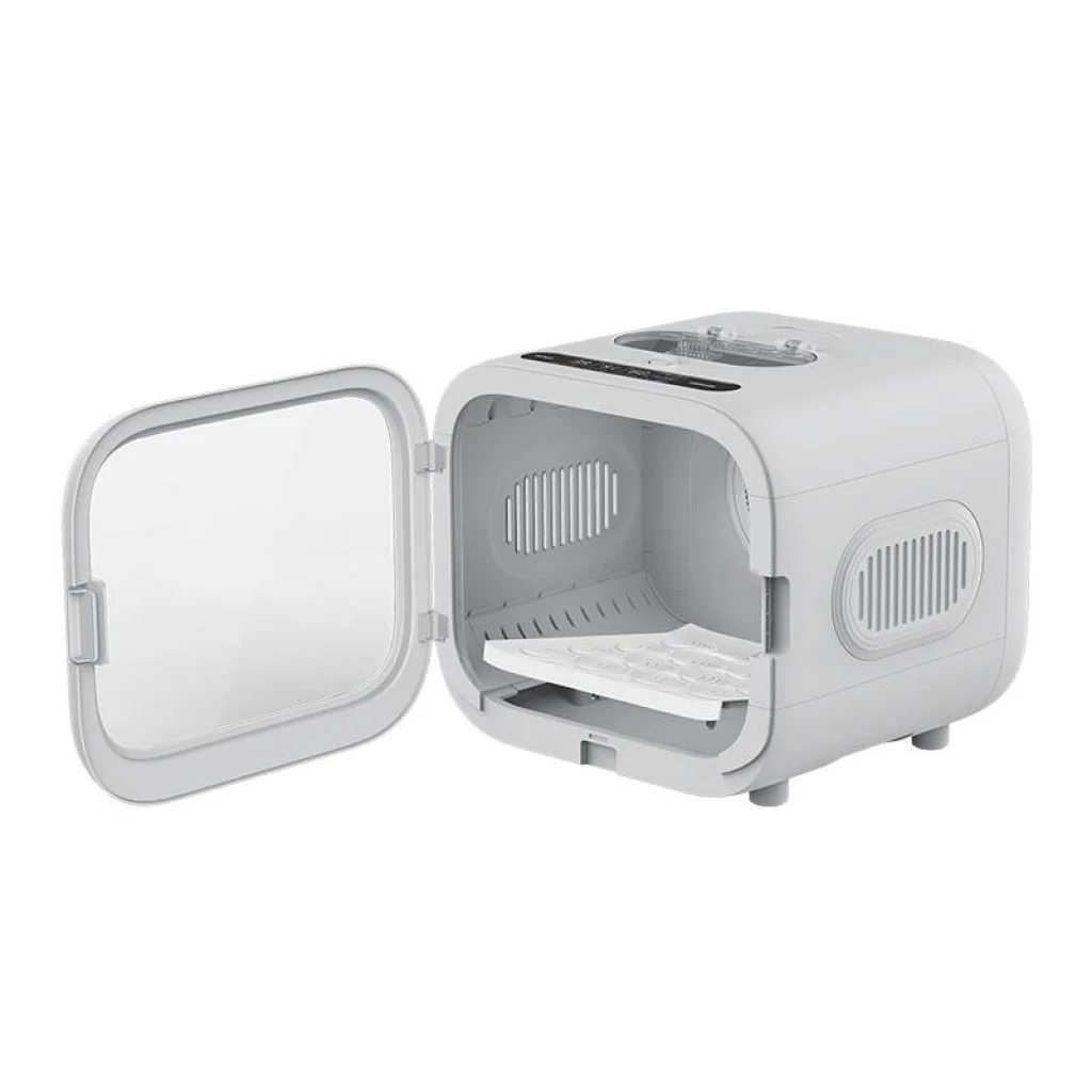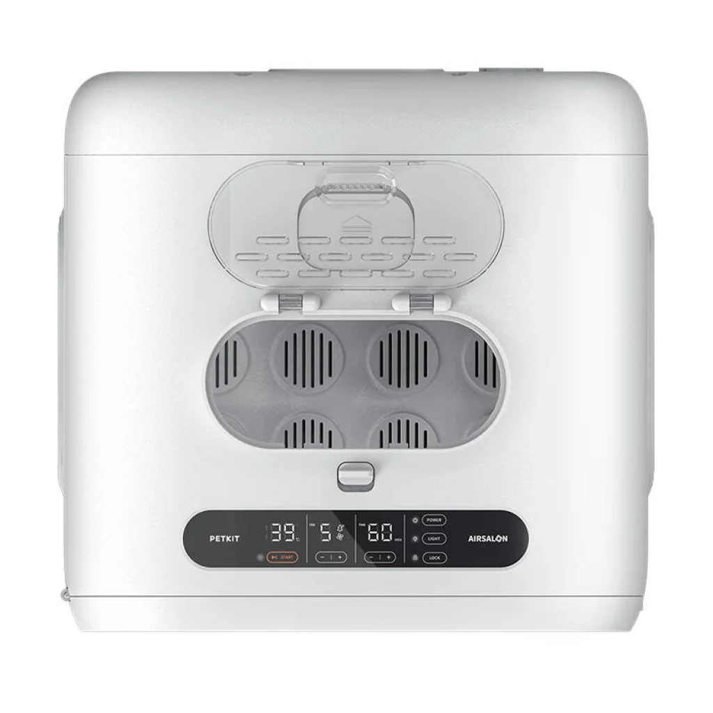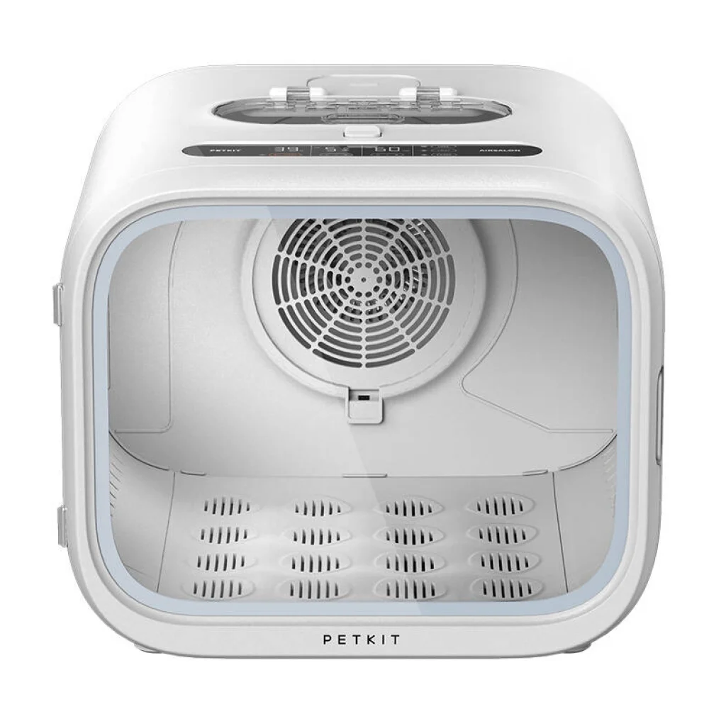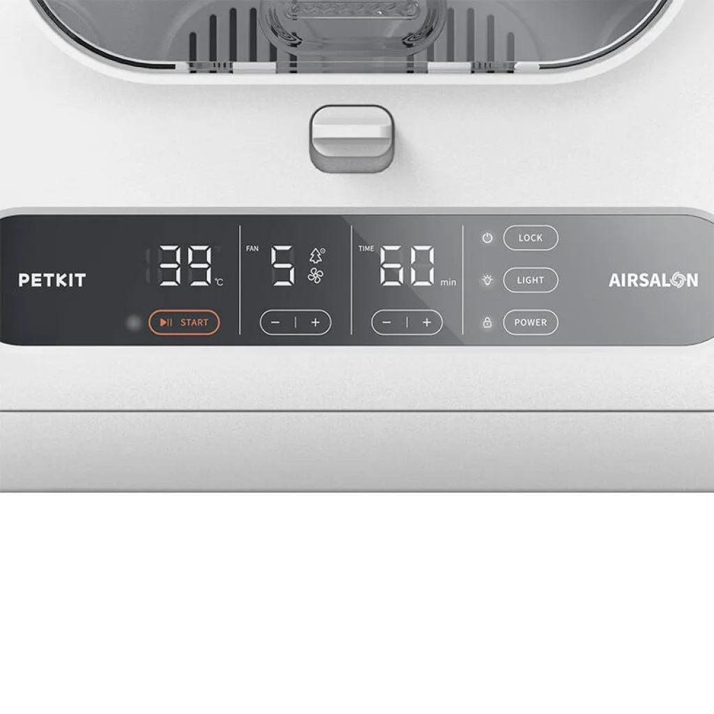 Eszköz tervezése: A PetKit kisállat szárító kocka alakú, lekerekített sarkokkal rendelkezik. Az eszköz három oldalán található szellőzőnyílások biztosítják friss levegőt kedvence számára, és gyengéd szellőt biztosítanak a bunda szárításához, még az érzékeny területeken is. Az eszköz alján egy kivehető panel található a könnyű tisztítás érdekében. Az AIRSALON MAX Pro belsejében elég nagy hely van két macska vagy kis kutya kényelmes elhelyezésére, hogy kinyúlhassanak és élvezhessék a meleg légáramot. A szárító előlapján átlátszó ajtók találhatók, hogy figyelemmel kísérhesse kedvence jólétét. Emellett egy érintésérzékeny LED panel is található a felhasználóbarát kezelés érdekében. A szárító mennyezetében beépített fény található, amely lehetővé teszi az állat szárítását akár éjszaka is.