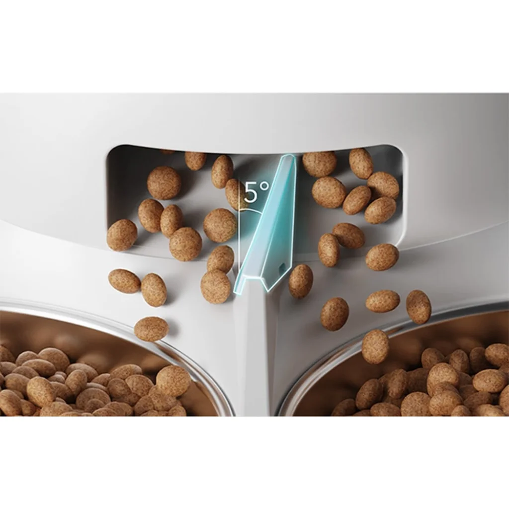 Az egyedülálló, állítható ételosztó gondoskodik az egyenlő adagokról, akár egy, akár két háziállatról van szó. A jobb szélső beállítás biztosítja az egyenletes adagolást mindkét tálba, míg a középső beállítás lehetővé teszi, hogy az egyik tálba több ételt juttasson. A mechanizmus hatékonyan és pontosan működik, így kiküszöböli az egyenlőtlen elosztás kockázatát.