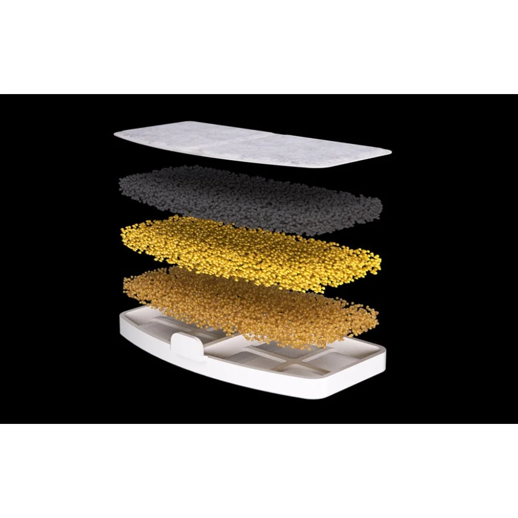 A Petoneer Fresco EZ itató a legmagasabb minőségű prémium szűrőanyagokkal van felszerelve, amelyek garantálják az ivóvíz kiváló tisztaságát és ízét. A többlépcsős szűrőrendszer környezetbarát PP pamutot tartalmaz, amely hatékonyan távolítja el a szőrszálakat, szennyeződéseket és finom részecskéket. Ezen felül Jacobi kókuszdióhéj aktív szén, Purolite ioncserélő gyanta és importált KDF szűrő az USA-ból gondoskodik a nehézfémek csökkentéséről és a mikrobiális növekedés gátlásáról. Így a víz nem csupán tiszta, hanem ízletes is marad.