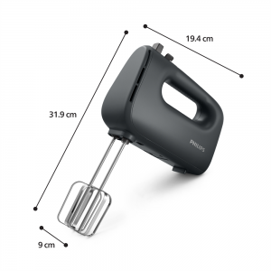 A Philips kézi mixer ergonomikus markolattal rendelkezik, amely kényelmes és biztos fogást nyújt még hosszabb használat során is. A tartozékok egyetlen gombnyomással, rendkívül egyszerűen és gyorsan kioldhatók, ami megkönnyíti a tisztítást és a tárolást. A készülék kompakt méretei (hosszúság: 31.9 cm, szélesség: 19.4 cm, magasság: 9 cm) lehetővé teszik a könnyű tárolást, akár kisebb konyhákban is.