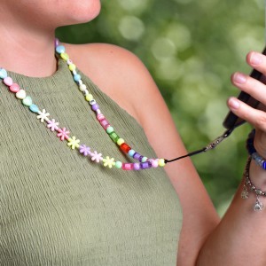 Gyöngyös telefon függő. A nyakba akasztható hosszú zsinórnak köszönhetően nem kell félretenned a kedvenc készülékedet. A bájos csillagokkal díszített minta tökéletesen illik a nyári, színes öltözékekhez. A Pixie függő tökéletes kiegészítője a mindennapi tevékenységeknek. Fényes műanyag gyöngyökből készült, a zsinór hossza 68 cm (hurokban 34 cm), és elég tartós ahhoz, hogy hosszú ideig használható legyen. Továbbá ez a hosszúság lehetővé teszi, hogy szabadon viseld a függőt a nyakadban, biztosítva a könnyű hozzáférést a telefonhoz vagy más eszközhöz, amit szeretnél kézközelben tartani. A függő lehetővé teszi a biztonságos rögzítést egy okostelefonhoz tokkal. Csak annyit kell tenned, hogy az eszköz és a tok közé helyezed a mellékelt kártyát úgy, hogy a horog a töltőcsatlakozóból kilógjon. Ily módon rögzítve a telefon szilárdan marad a zsinóron, így nem kell aggódnod a hirtelen lecsúszás vagy véletlen kioldás miatt. Specifikáció: Anyag: műanyag, többszínű csillag alakú gyöngyök Zsinór hossza: 68 cm Zsinór hossza a hurokban: 34 cm Horog a telefonra való rögzítéshez