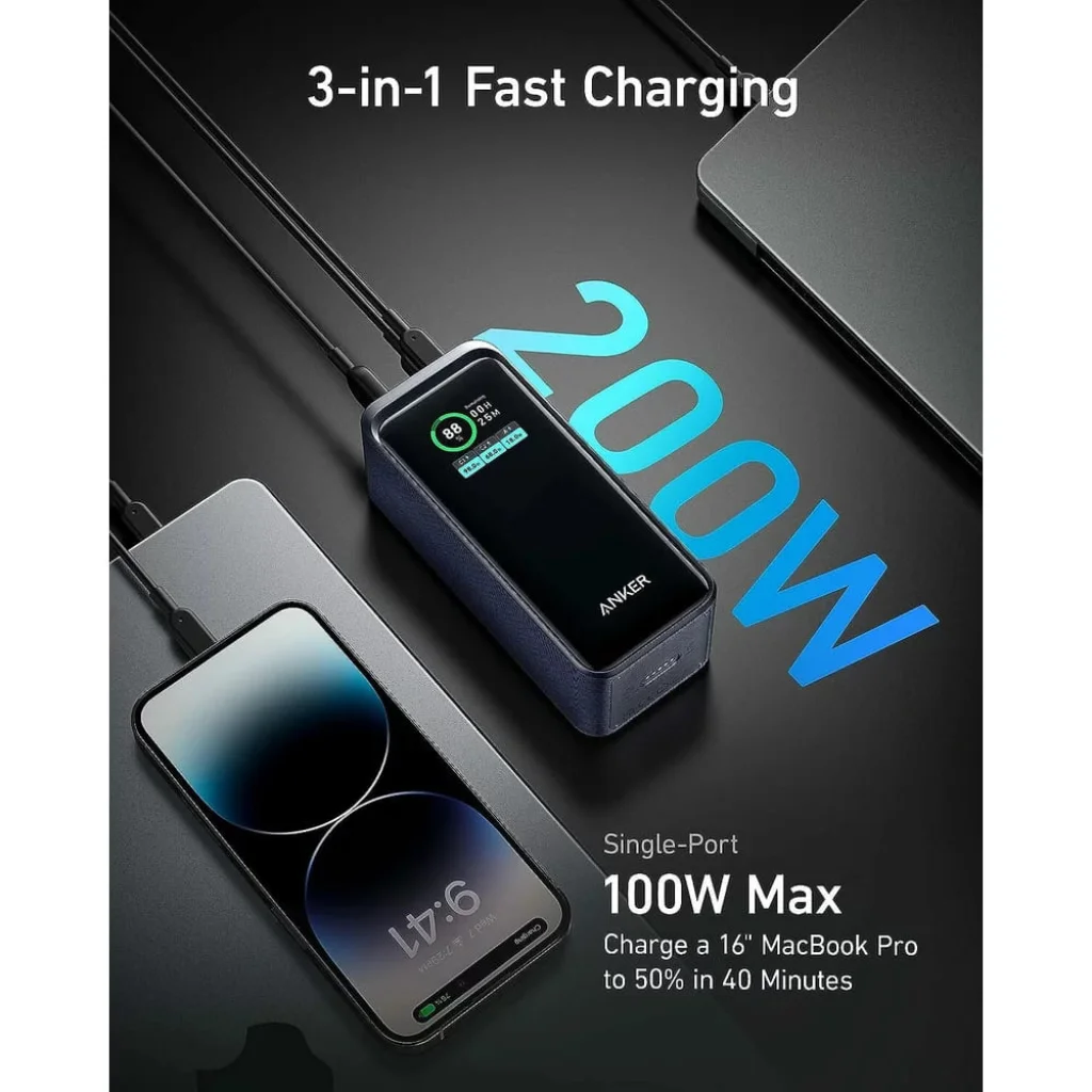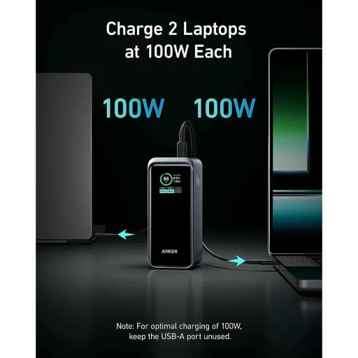 Élvezze a villámgyors, 3-az-1-ben gyors töltést az Anker Prime power bankkal, amely akár 200W összteljesítményt biztosít a két USB-C és egy USB-A portján keresztül. Egyetlen USB-C porton keresztül akár 100W maximális teljesítményre is képes, amivel egy 16 hüvelykes MacBook Pro laptopot 40 perc alatt 50%-ra tölthet. Ráadásul egyszerre két laptopot is tölthet 100W-tal, feltéve, hogy az USB-A port használaton kívül marad az optimális 100W-os kimenet eléréséhez.
