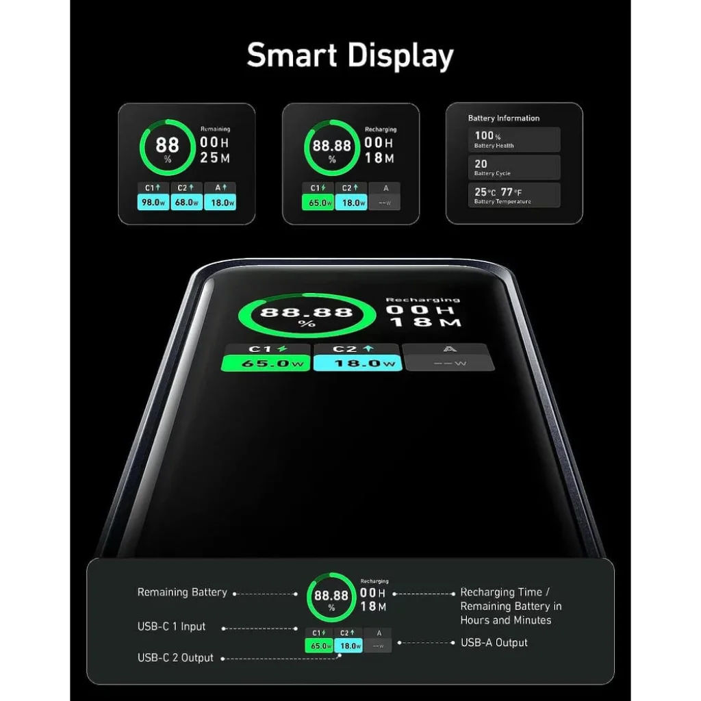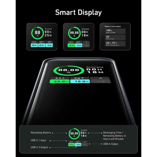 A beépített intelligens digitális kijelző azonnali és részletes áttekintést nyújt a power bank állapotáról. Láthatja a hátralévő töltöttségi szintet (%), a hátralévő üzemidőt vagy a teljes újratöltési időt órákban és percekben. Figyelje az egyes USB-C és USB-A portokon keresztül leadott vagy felvett teljesítményt (W), sőt, akár az akkumulátor állapotát (Battery Health), töltési ciklusait (Battery Cycles) és hőmérsékletét (Battery Temperature) is.