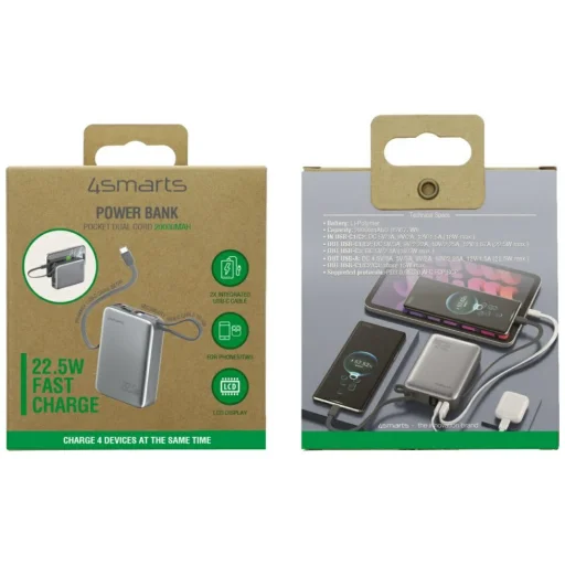 Powerbank 4smarts Pocket Dual Cord 20000mAh 22.5W beépített USB-C kábel 15cm szürke