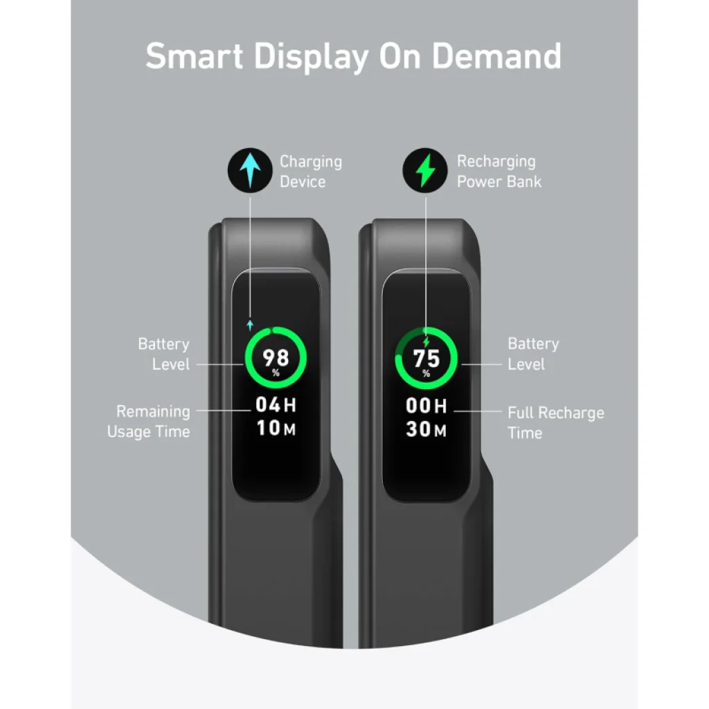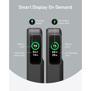 Az integrált okos digitális kijelző valós idejű információkat kínál, így Ön mindig képben lehet. Egy pillantással láthatja az akkumulátor szintjét, a csatlakoztatott eszköz hátralévő használati idejét, valamint magának a powerbanknak a teljes feltöltéséig hátralévő időt, biztosítva a maximális ellenőrzést és nyugalmat.