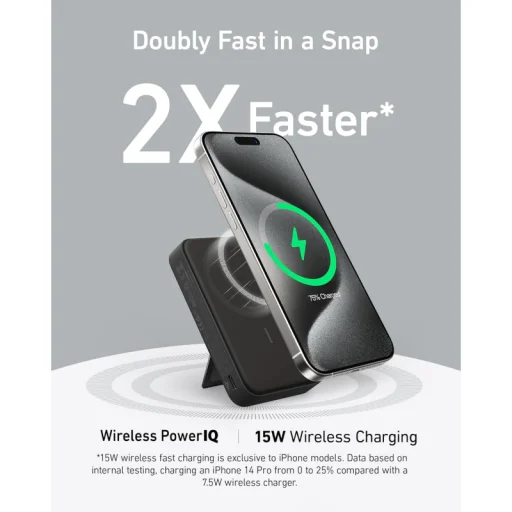Élvezze a szabadságot a kábelek kuszasága nélkül! Az Anker MagGo Powerbank Qi2 tanúsított vezeték nélküli töltéssel rendelkezik, amely akár 15W-os teljesítményt biztosít a kompatibilis eszközök számára. Ez a fejlett technológia kétszer gyorsabb töltést tesz lehetővé, mint a hagyományos 7.5W-os vezeték nélküli töltők, így például egy iPhone 14 Pro 0-ról 25%-ra tölthető fel rendkívül rövid idő alatt. A mágneses rögzítés biztosítja, hogy készüléke tökéletesen illeszkedjen és stabilan töltsön, még használat közben is.