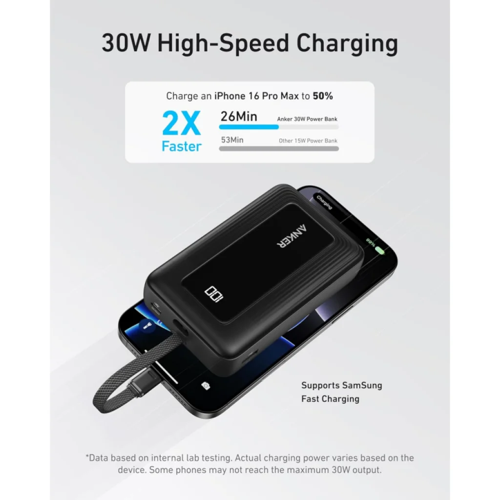 A Powerbank Anker Zolo egyik leginnovatívabb funkciója a beépített 5,98 hüvelykes (kb. 15 cm-es) USB-C kábel, amely maximális kényelmet biztosít, és búcsút inthet az elveszett vagy összegabalyodott kábeleknek. A kábel tartóssága kivételes: tesztek szerint több mint 10.000 hajlítást is kibír, így a mindennapi használat során is hosszú távon megbízható teljesítményt nyújt. A készülék elején található digitális kijelzőn mindig pontosan nyomon követheti a hátralévő energiaszintet.