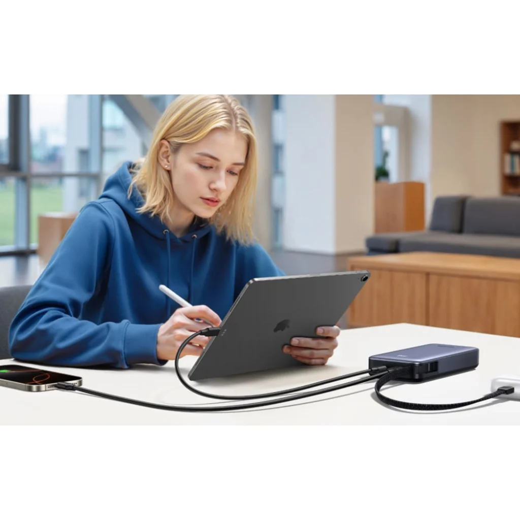 Az UGREEN PB536 három különböző kimenetet kínál, így sosem kell választania, melyik eszközét töltse fel előbb. Használja a beépített USB-C kábelt, a kiegészítő USB-C portot, vagy az USB-A portot, hogy egyszerre töltse telefonját, táblagépét, és akár fejhallgatóját, okosóráját vagy egy hordozható Bluetooth hangszórót. Ez a rugalmasság különösen hasznos utazáskor, vagy amikor barátokkal osztaná meg az energiát egy kényelmes piknik során, ahogyan az a felhasználási képeken is bemutatásra került.