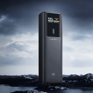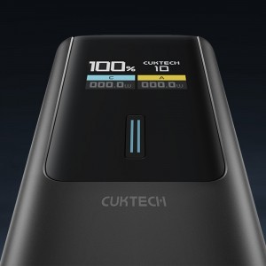 The Cuktech CKPB100PGLBL is a modern power bank with a capacity of 10,000 mAh and output of up to 150W, providing ultra-fast charging for laptops, smartphones, and tablets. With a USB-C output of up to 120W and a USB-A output of up to 33W, you can charge even the most demanding devices. The color TFT screen displays key information about voltage, current, charge level, and remaining runtime in real time. The power bank supports fast reverse charging up to 90W, allowing you to replenish 55% of its capacity in just 15 minutes. Despite its enormous capabilities, it remains compact and lightweight, and its VO265 fire-resistant housing and nine layers of protection ensure complete safety.