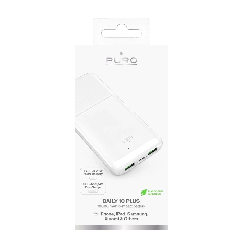 Powerbank Puro DAILY 10 PLUS 10000mAh 2x USB-A / 1x USB-C 22.5W PD AFC - fehér A Puro DAILY 10 PLUS powerbank 10000mAh kapacitással tökéletes megoldás számodra! Három kimenettel felszerelve (2x USB-A és 1x USB-C) lehetővé teszi több eszköz egyidejű töltését. A 22.5W maximális teljesítmény és a PD valamint AFC protokollok támogatása gyors és hatékony töltést biztosít. A tűzálló anyagokból készült szilárd konstrukció biztonságos használatot garantál. Próbáld ki még ma és élvezd a megszakítás nélküli energiát útközben, a munkában és minden nap.
