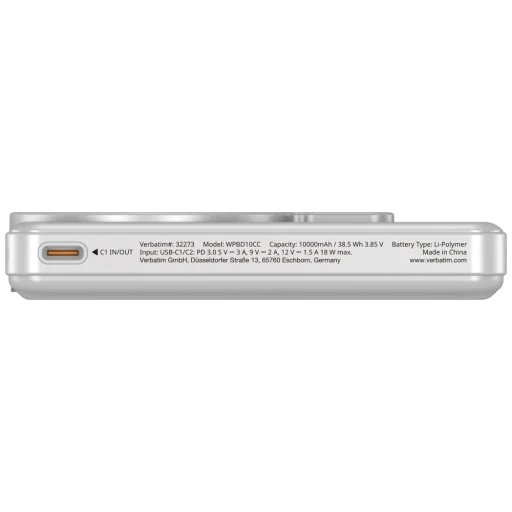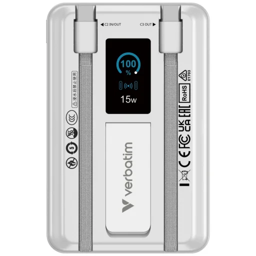 A Verbatim Charge 'n' Go powerbank egy praktikus energiaforrás 10000 mAh-es kapacitással, amelyet okostelefonok és mobil eszközök mindennapi töltésére terveztek. A modell TFT kijelzőt használ, amely mutatja az energiaszintet és az aktuális működési állapotot. Az eszköz kombinálja a vezetékes és vezeték nélküli töltést, növelve ezzel a kényelmet és rugalmasságot. Kompakt méretének köszönhetően a termék könnyen elfér egy táskában vagy hátizsákban, és egyszerre több eszköz töltésére is képes, növelve ezzel funkcionalitását. A Charge 'n' Go jól működik mind utazás, mind mindennapi tevékenységek során. Az eszköz átfogó tápellátási lehetőségeket kínál három USB-C portjának és a vezeték nélküli töltési modulnak köszönhetően. Két beépített USB-C kábel gyors eszköz-csatlakozást tesz lehetővé, és a PD 3.0 kompatibilis portok akár 22.5 W teljesítményű töltést is támogatnak. Az additional USB-C port akár 12 W kimeneti teljesítményt biztosít. A vezeték nélküli töltés támogatja az 5 W, 7.5 W, 10 W és 15 W szinteket, míg az okosóra részleg 2.5 W-ot kínál. Az eszköz a PD 3.0, QC 3.0, Apple 2.4 A, BC 1.2, DCP és AFC protokollokkal kompatibilis, biztosítva a különféle mobil eszközök stabil és hatékony töltését.