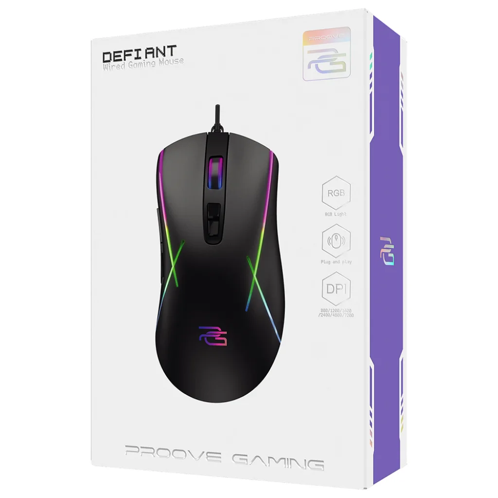- Működési mód: A Proove Gaming Defiant egér egy 1,5 méteres USB kábellel működik, amely számítógéphez vagy laptophoz csatlakozik, ez lehetővé teszi a kiegészítő korlátlan használati idejét. További gombok lehetővé teszik az egér sebességének szabályozását és az oldalak közötti váltást.