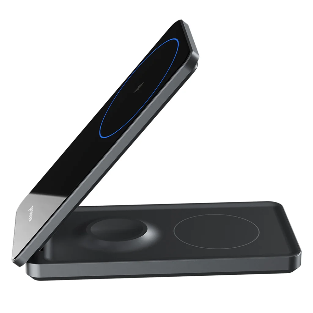 - Funkcionalitás: Három eszköz egyidejű töltése (óra, fejhallgató, okostelefon) teljesítményveszteség nélkül. Kompakt érintkezési pontok, amelyek nem ütköznek egymással.