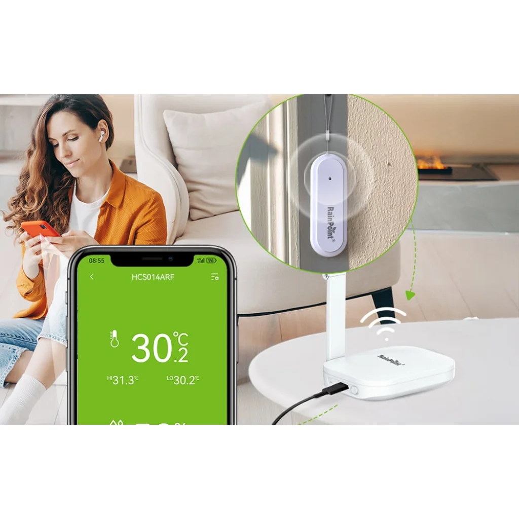 A RainPoint HCS014ARF segítségével pontosan figyelemmel kísérheti a környezeti feltételeket. Ez a hőmérséklet- és páratartalom-érzékelő -40 °C és 60 °C közötti hőmérsékletet, valamint 1% és 99% közötti relatív páratartalmat mér. A készülék nyílt terepen akár 100 méteres hatótávolsággal rendelkezik, és a Smart+ rendszerrel, valamint a mobilalkalmazással együttműködve kényelmes hozzáférést biztosít a valós idejű adatokhoz. Kompakt méreteinek (130 × 47 × 24 mm) és a 2 darab AA elemmel működő tápellátásnak köszönhetően az érzékelő könnyedén elhelyezhető bárhol a szabadban.