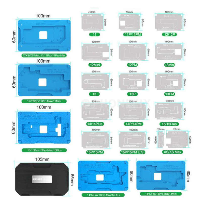 A Reballing tartó Relife RL-601T egy professzionális eszköz, amely az iPhone alaplapok precíz javítására lett tervezve az iPhone X-től az iPhone 15-ig terjedő modellekhez. Három, magas hőmérsékletnek ellenálló erős mágnesnek köszönhetően stabil és pontos rögzítést biztosít, mely szilárdan tartja az alaplapot elmozdulás nélkül, még magas hőmérsékletű műveletek során is. A szerkezet kiváló minőségű acélból készült, gondosan igazított kerek és négyzet alakú lyukakkal, melyek elősegítik az egyenletes forrasztógolyó képzést és megakadályozzák a hálózat eltömődését. Az alap egy környezetbarát kőből készült, amely tartós, szennyeződés-ellenálló és könnyen tisztítható, így ideális a hatékony és tiszta munkakörnyezethez.