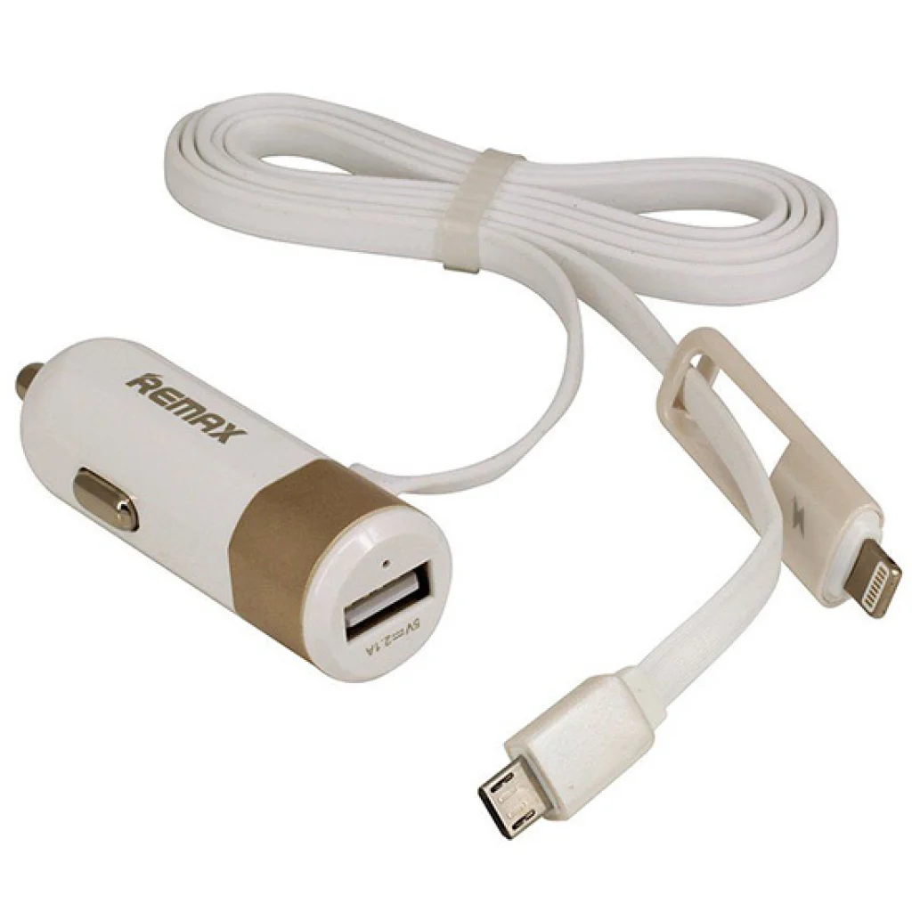 A Remax RCC-102 autós töltő megbízható és működőképes. Beépített kábele van micro USB hegyével és USB csatlakozóval. Ezen kívül ez a töltőkészülék emellett Lightning csúccsal is fel van szerelve, így egyszerre két telefont is csatlakoztathat a töltéshez. A töltő előnye a megjelenése és a mérete. Lapos kábel is van hozzá.