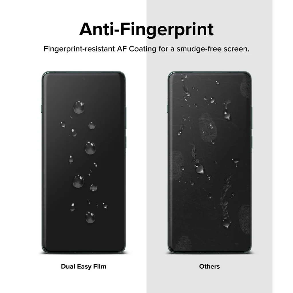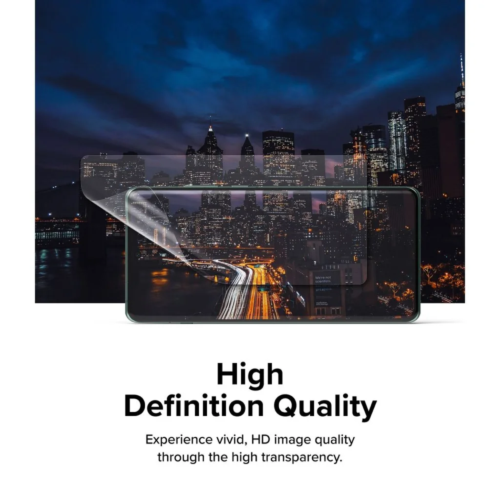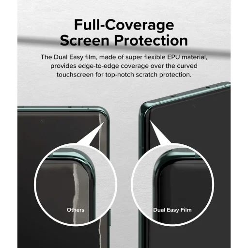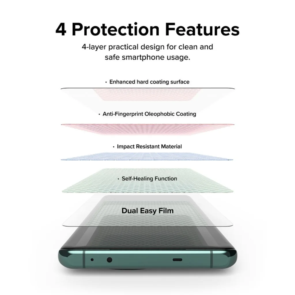 Kristálytiszta Ringke Dual Easy védőfólia, mely az egész képernyőt lefedi. Magas minőségű uretán polikarbonátból készül, és 3H keménységű karcállósággal rendelkezik, hatékonyan védve a képernyőt a sérülésektől. A fólia tökéletesen visszaadja a megjelenített színeket, és speciális oleofób bevonattal rendelkezik, amely megakadályozza az ujjlenyomatok maradását a képernyőn. További előnye, hogy a legtöbb tokhoz illeszkedik, megszűnik az a probléma, hogy a tokot a kijelzővédelemhez kell igazítani. Telepítése rendkívül egyszerű és bárki által könnyen elvégezhető, mivel úgy tervezték, hogy ne hagyjon légbuborékokat a felhelyezést követően.