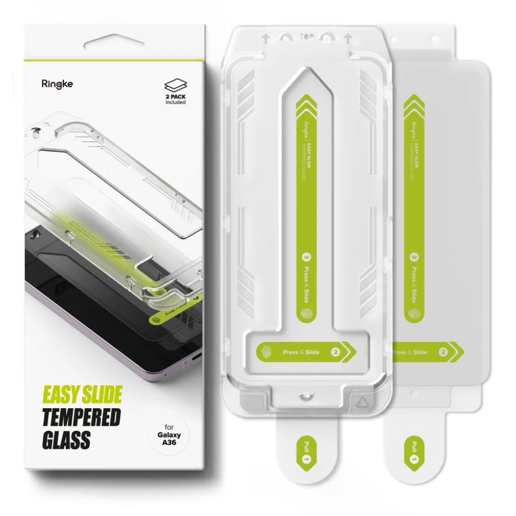 A kristálytiszta Ringke Easy Slide edzett üveg tökéletesen visszaadja a megjelenített színeket, és nem befolyásolja az érintés érzékenységét. Újrahasznosított és megerősített edzett üvegből készült. A magas fokú keménység (9H) biztosítja, hogy az Easy Slide ellenálló legyen a karcolásokkal szemben, még éles tárgyakkal (kés vagy kulcs) való érintkezés során is. Az üveget egy speciális oleofób bevonattal látták el, amely minimalizálja az ujjlenyomatok vagy egyéb szennyeződések hagyását az üveg felületén. Az Easy Slide kifejezetten a képernyő karcolásoktól és a váratlan telefon leejtésekből eredő ütések elleni védelmére lett tervezve. Emellett a könnyű telepítés érdekében a készlet tartalmaz egy Easy Slide szerelőeszközt, amely megkönnyíti és pontosabbá teszi az üveg alkalmazását. A kijelzők változatos szélmarása miatt az üvegfólia telepítését követően a képernyő körül enyhe légies aurára lehet számítani. Ez természetes helyzet, amely a képernyő sajátosságaitól függ.