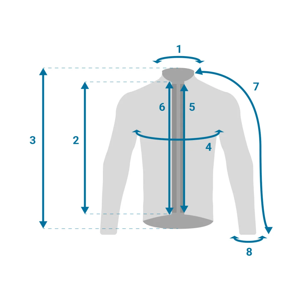 | Méret | 1) Nyakbőség (cm) | 2) Eleje hossz (cm) | 3) Háta hossz (cm) | 4) Mellbőség (cm) | 5) Belső cipzár hossza (cm) | 6) Külső cipzár hossza (cm) | 7) Ujjhossz (cm) | 8) Mandzsetta (cm) |