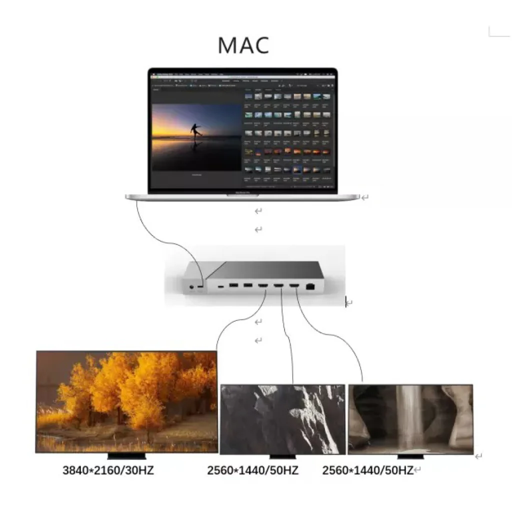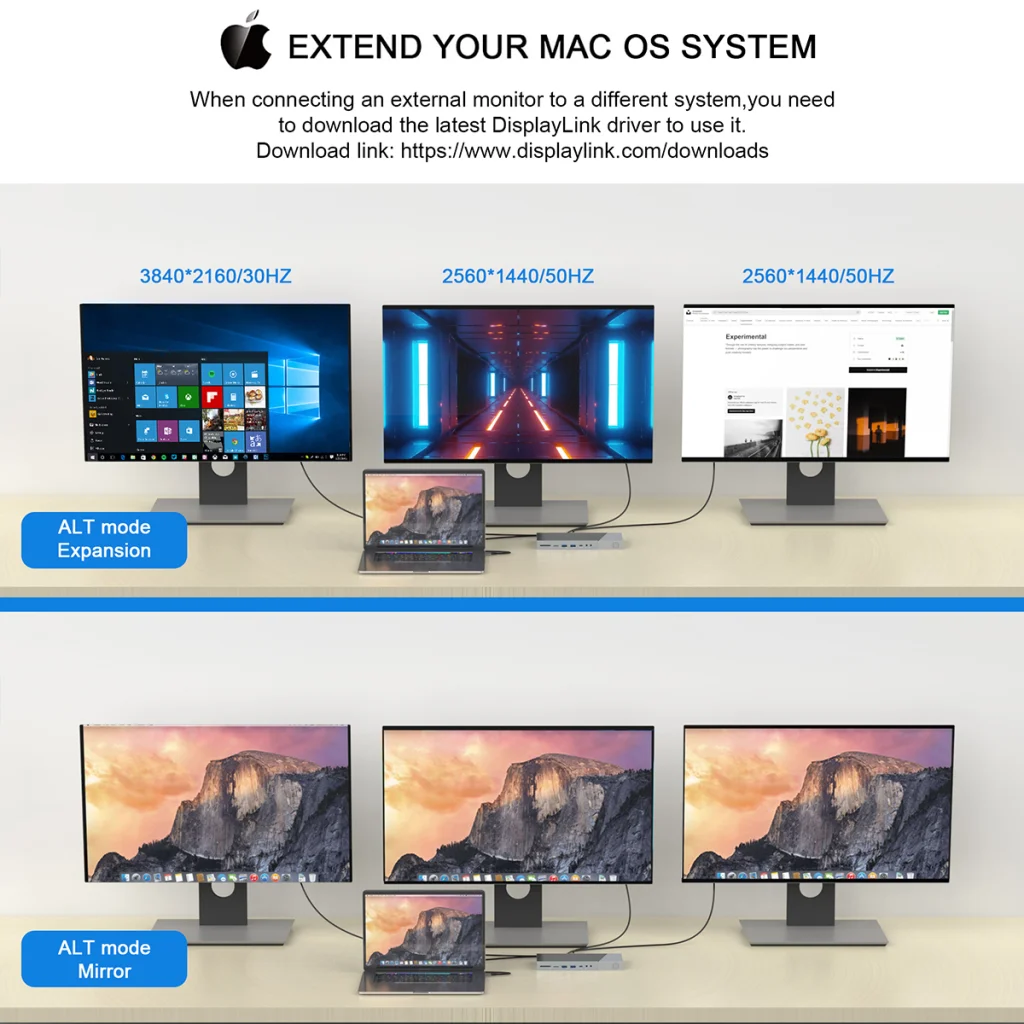 - macOS rendszerek: A DisplayLink driver telepítésével teljes mértékben kihasználhatja a dokkoló képességeit. Akár három külső kijelzőt is csatlakoztathat, például egy 3840x2160@30Hz és két 2560x1440@50Hz felbontású monitort kiterjesztett vagy tükrözött módban.