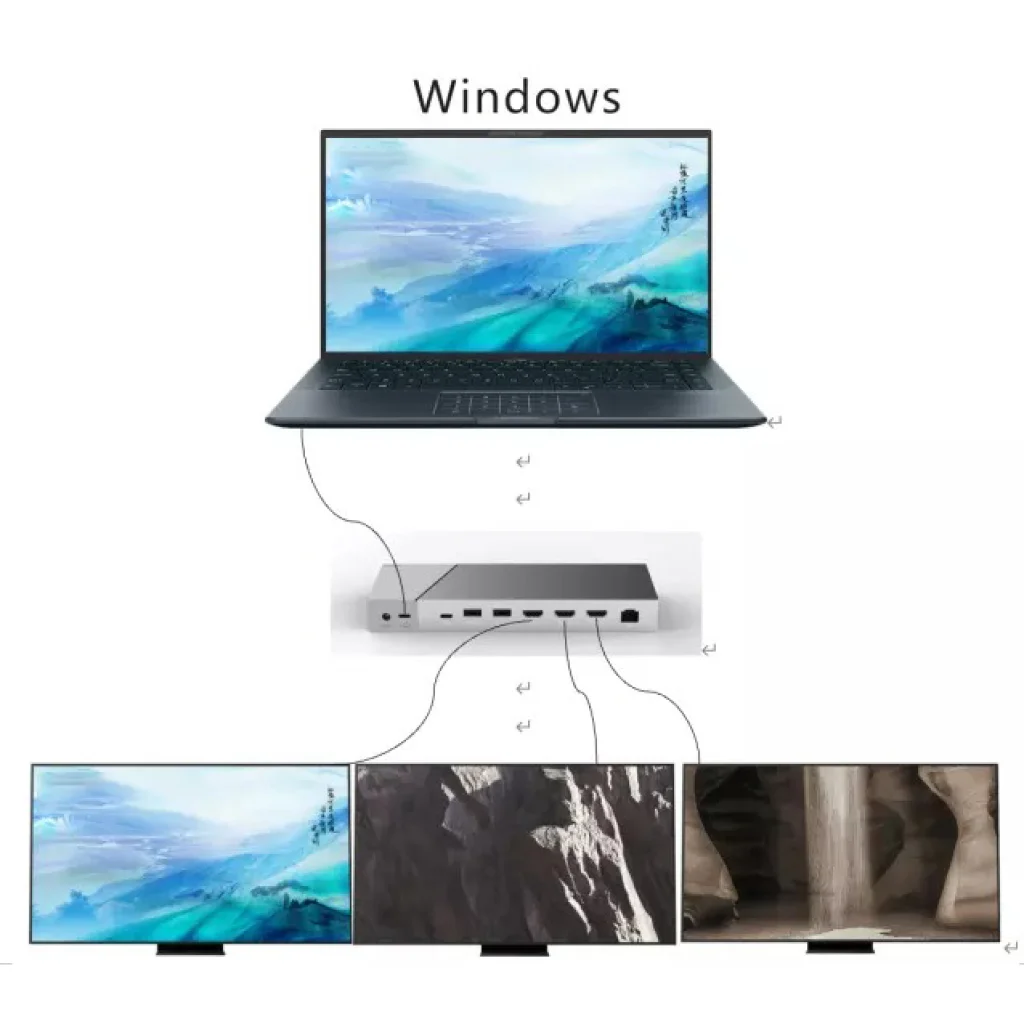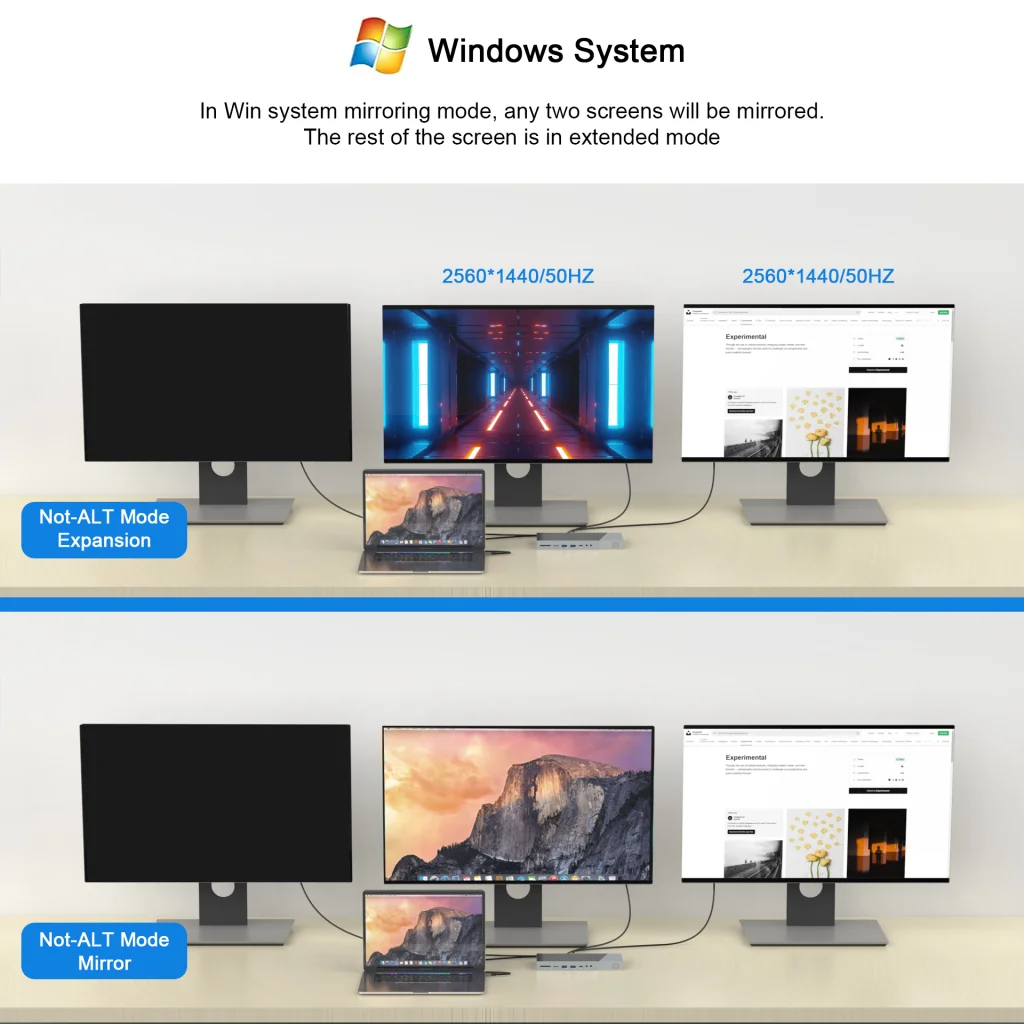 - Windows rendszerek: Élvezze a rugalmas kiterjesztett vagy tükrözött módokat. A DisplayLink segítségével akár három külső monitor is csatlakoztatható, például két 2560x1440@50Hz felbontású kijelző. A tükrözött módban tetszőlegesen választhat két kijelzőt, amelyek a laptop képernyőjét tükrözik, míg a többi kiterjesztett módban működik.
