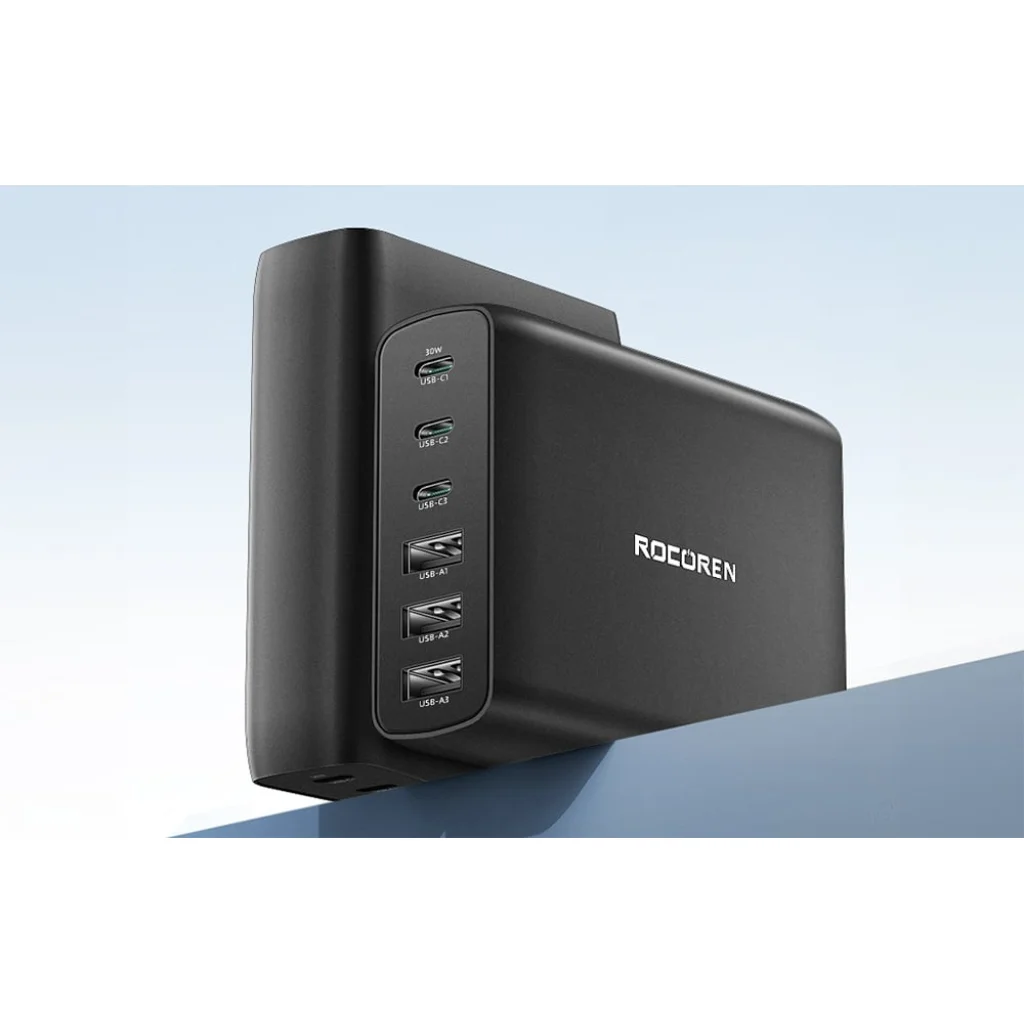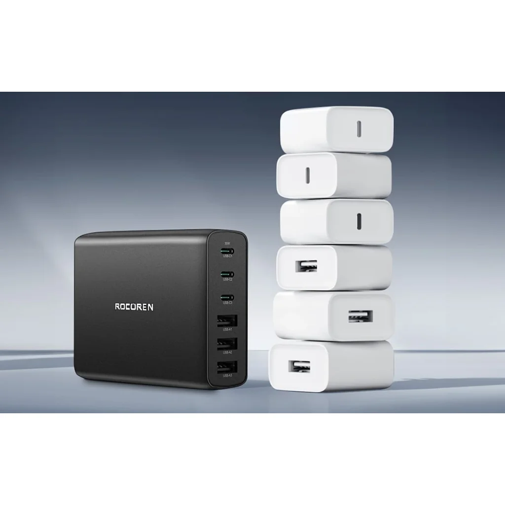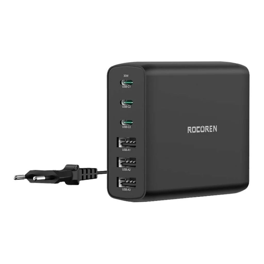 GaN Rocoren fali töltő 3x USB-C, 3x USB, 100W (fekete)