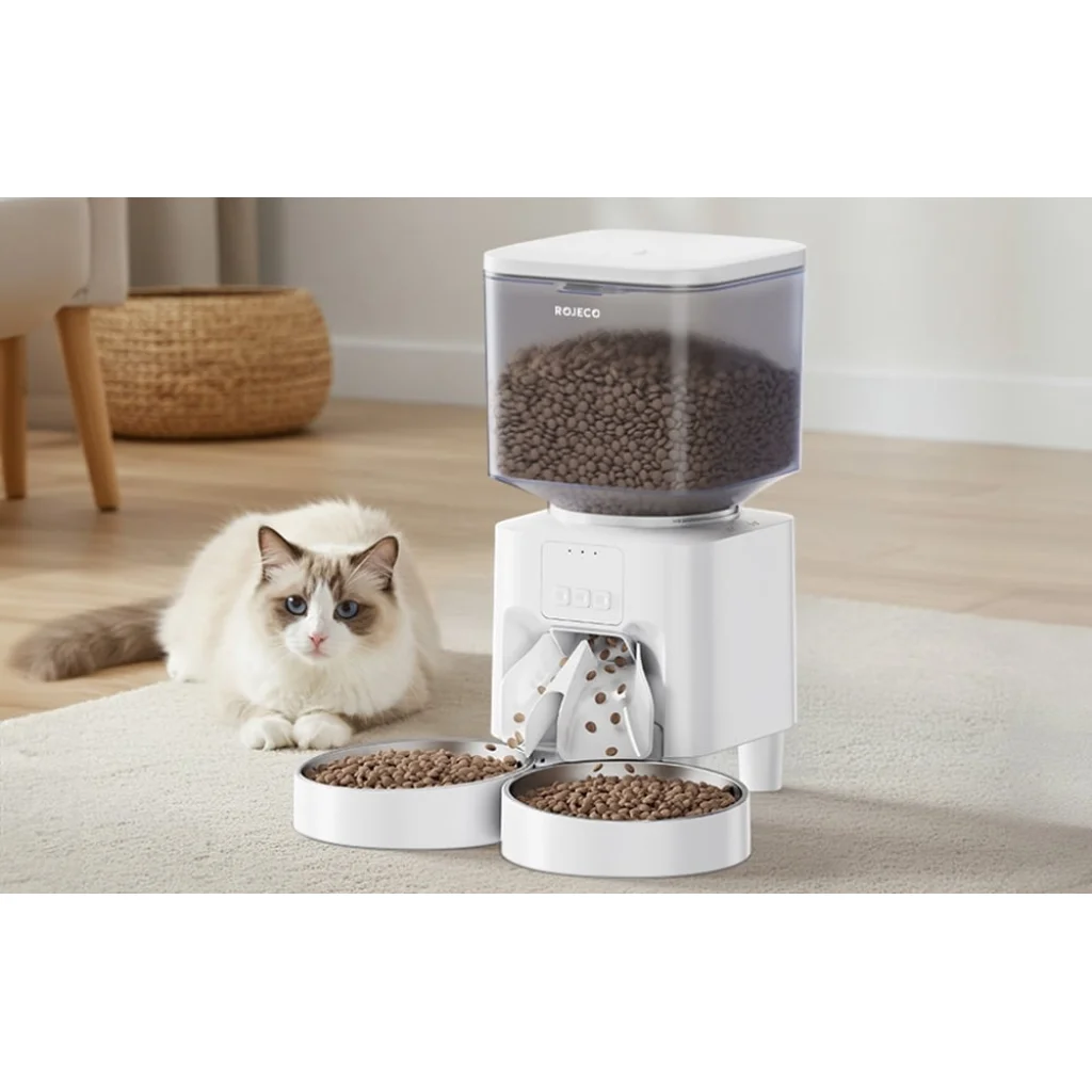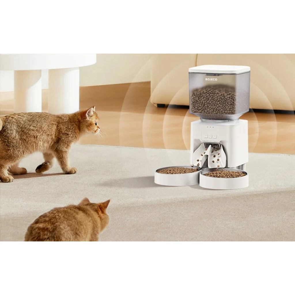 A Rojeco etető megbízható társ a mindennapokban. Harapásgátlóval ellátott kábellel érkezik, mely megóvja a készüléket a játékos rágcsálásoktól. A 304-es rozsdamentes acélból készült tálak tartósak, higiénikusak és könnyen tisztíthatóak. A készülék kettős üzemmódú (hálózati és akkumulátoros), így áramszünet esetén is megbízhatóan működik, biztosítva a folyamatos ételellátást. A bőséges 4,5 literes kapacitás körülbelül 15 napra elegendő két macska számára, ami ideális hosszabb távollétek esetén is.