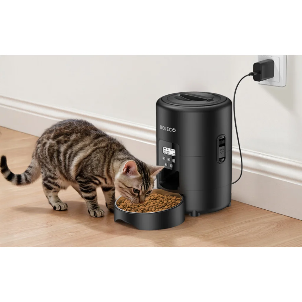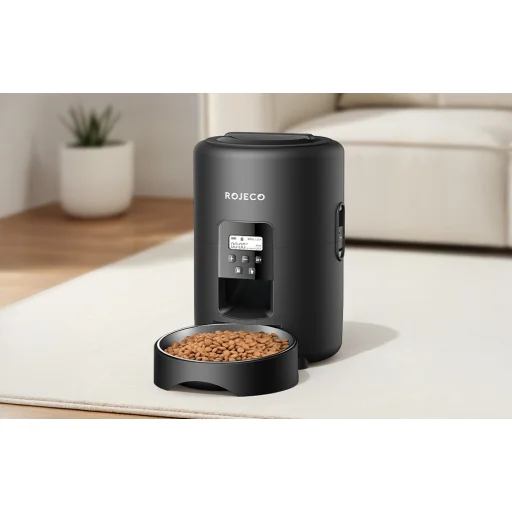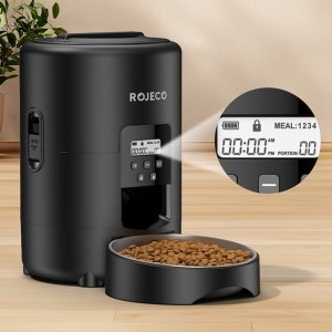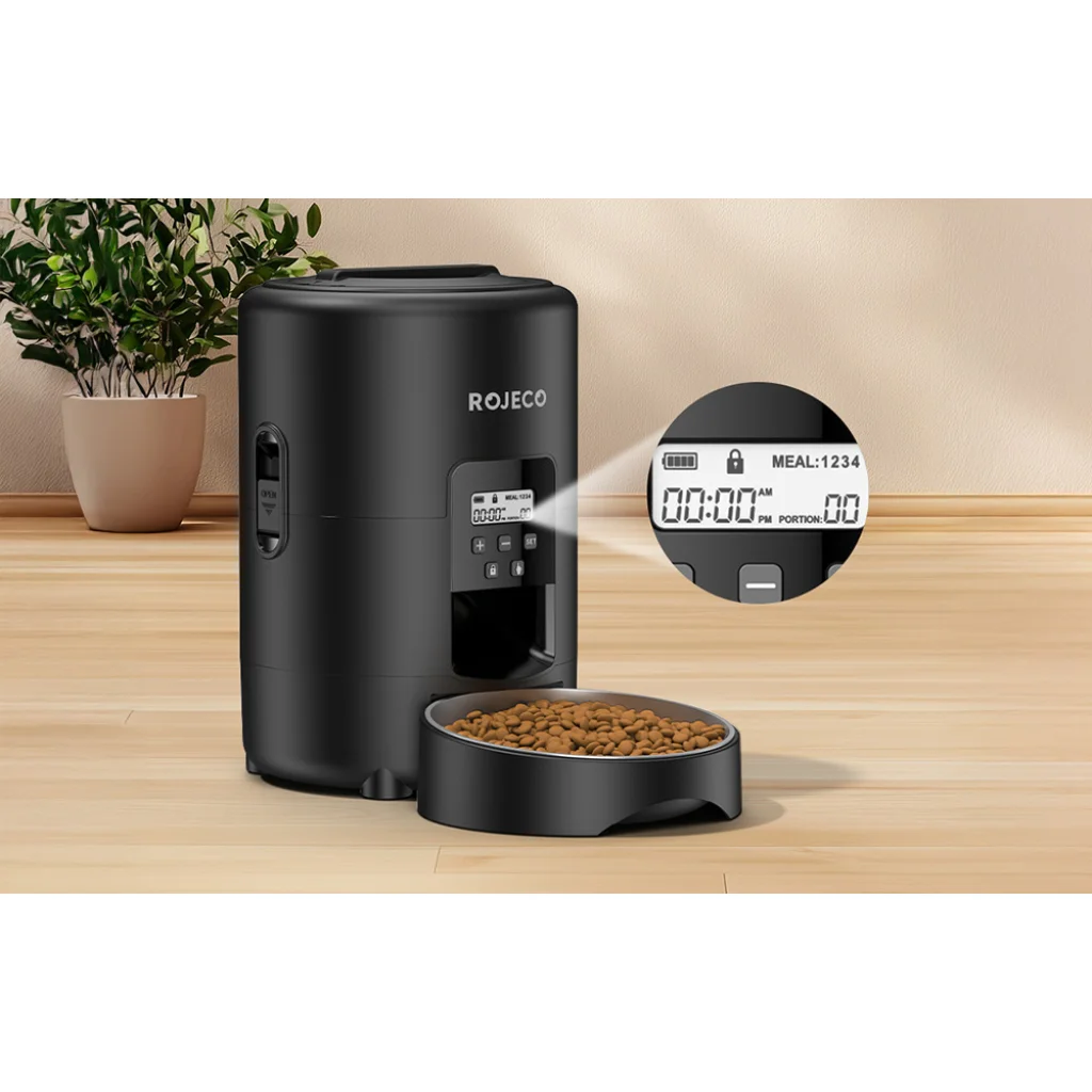 Biztosítson kedvencének egészséges, ízletes eledelt meghatározott időpontokban. A Rojeco 2 literes automata ételadagolója egyesíti magában a napi 1-4 étkezés ütemezését, a pontos adagolást (1-40 adag, egyenként 10 g), a higiénikus 304 rozsdamentes acélból készült tálat, a kétféle energiaellátási lehetőséget, valamint a kényelmes nyomógombos és LED-képernyős kezelést. Az elakadásgátló rendszer biztosítja a zökkenőmentes etetést, a kivehető kialakításnak köszönhetően pedig könnyen tisztítható.