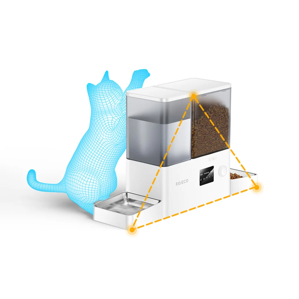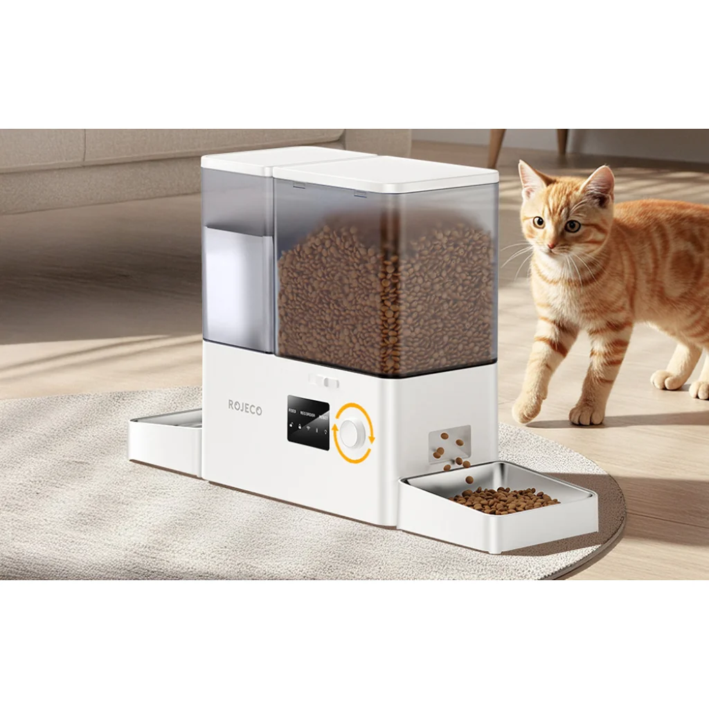 A Rojeco Button Version 2 az 1-ben szökőkút és ételadagoló egy minden egyben megoldás a macskák és a kis és közepes méretű kutyák tulajdonosai számára a friss víz és a pontosan adagolt ételek biztosítására. A víz és a szárazeledel számára elkülönített tartályokkal az eledel friss marad, és nem keveredik a vízzel, növelve kedvence kényelmét az étkezések során. A szifon elvén alapuló automatikus vízutántöltő rendszer azt jelenti, hogy a háziállat mindig tiszta vízhez jut, anélkül, hogy naponta újra kellene tölteni. További előnye ennek a modellnek, hogy az etetést a mobilalkalmazásból is vezérelheti, ami még nagyobb kontrollt és kényelmet biztosít.