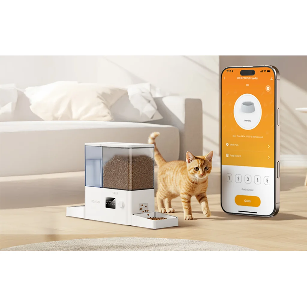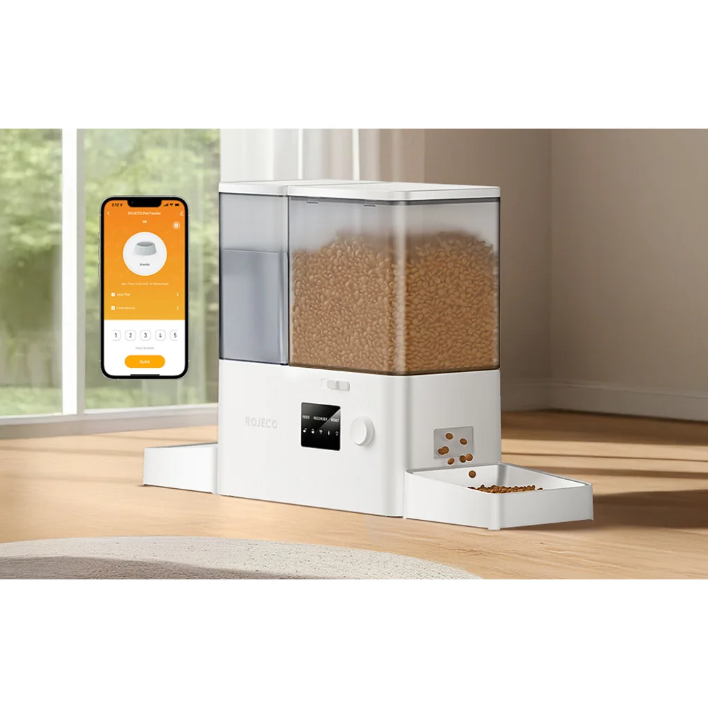 A Rojeco WiFi változat lehetővé teszi, hogy egy erre a célra kifejlesztett alkalmazáson keresztül bárhonnan távolról irányíthassa kedvence etetését. Beállíthatja kedvence étkezési ütemtervét, beállíthatja az adagokat, és értesítést kaphat az alacsony tápszintről vagy a készülékkel kapcsolatos bármilyen problémáról. Ez a funkció biztosítja, hogy kedvence soha nem marad éhen, még akkor sem, ha Ön nincs otthon. Az alkalmazás azt is lehetővé teszi, hogy egyetlen kattintással manuálisan plusz adag ételt etessen, így teljes rugalmasságot biztosít kedvencének étrendjének testre szabásához.